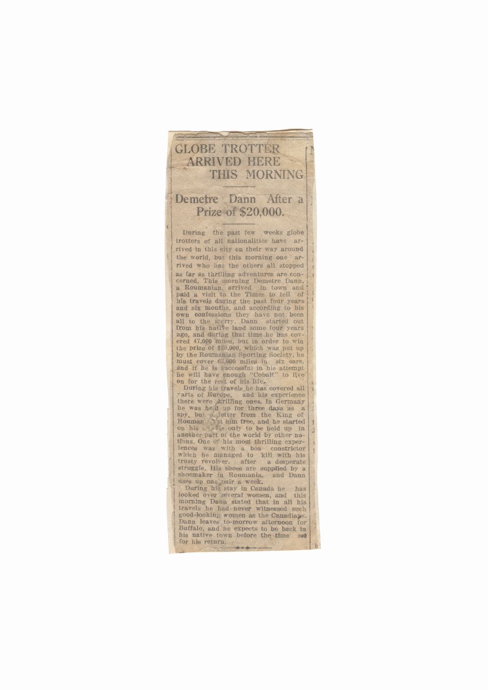 Fragment de ziar reprezentand un articol din ziarul Hamilton Times referitor la sosirea lui Dumitru Dan in orasul Hamilton, Ontario, Canada. Articolul face referire la arestul din Germania, la un incident cu un sarpe Boa si la frumusetea femeilor canadiene; va pleca a doua zi spre Buffalo. Dimensiuni: 6,1 x 18 cm. Stare conservare: buna, indoit, rupt si dezlipit partial. Material/tehnica: hartie, tiparire, tus negru.