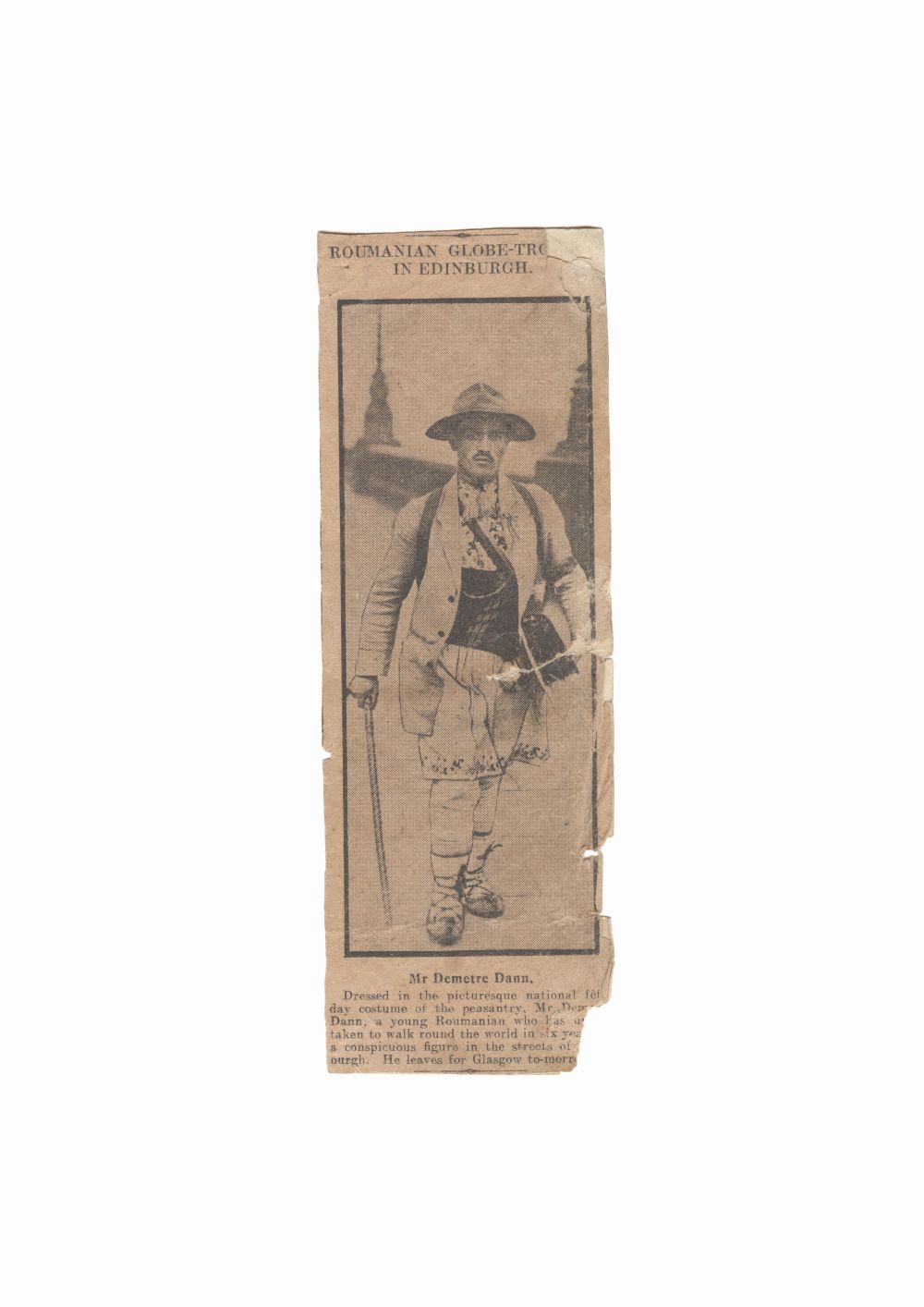 Fragment din ziarul "Scotsman" relatand vizita lui Dumitru Dan la Edinburg, Marea Britanie. Dimensiuni: 6,5 x 19,1 cm. Stare de conservare: buna, hartie usor ingalbenita si patata, lipsa material pe latura dr., mici rupturi marginale necesita restaurare. Material/tehnica: hartie, tiparire, tus negru, lipire pe o bucata coala alba.