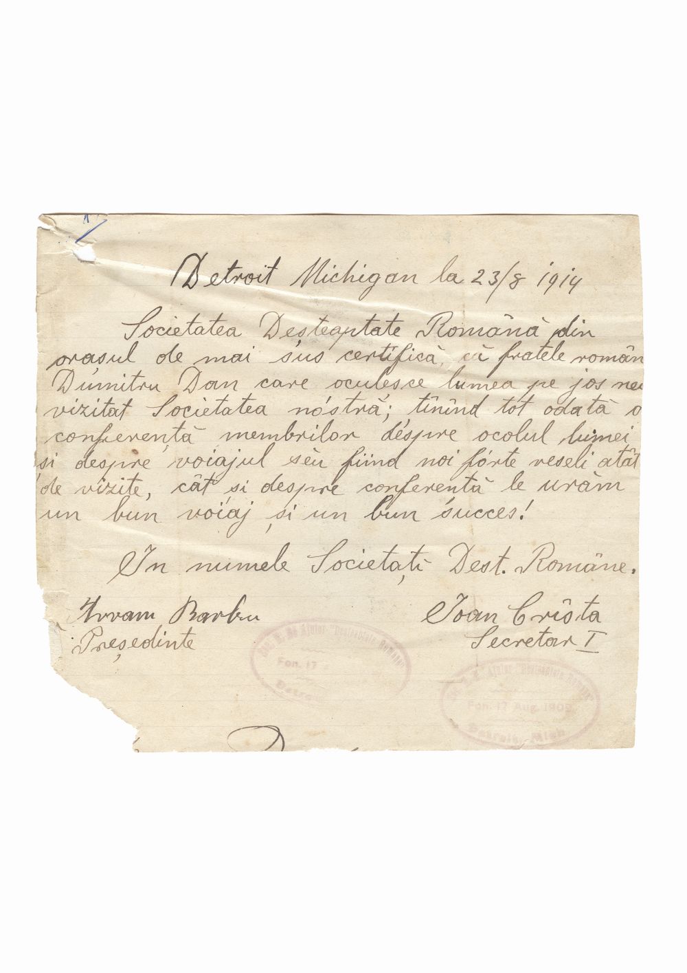 Document privind vizita lui Dumitru Dan la Societatea Desteapta-te romane din orasul Detroit, Michigan, Statele Unite ale Americii. Dimensiuni: 18,3 x 16,3 cm. Stare de conservare: buna, hartie usor ingalbenita si patata, colt stg. jos lipsa material, necesita restaurare. Material/tehnica: hartie tip dictando, mss, tus negru, 2 stampile ovale - tus violet, 2 semnaturi.