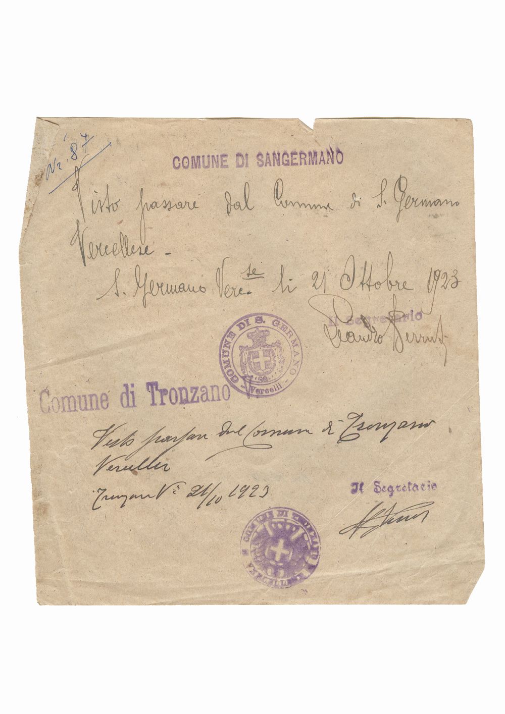 Document pivind vizita lui Dumitru Dan la primariile oraselor Sangermano, Vercelli si Tronzano, Italia. Dimensiuni: 19 x 20 cm. Stare de conservare: buna, hartie usor ingalbenita si patata, colturi indoite, necesita. Material/tehnica: hartie, mss, tus negru, 2 stampile rotunde, tus violet, 2 semnaturi.