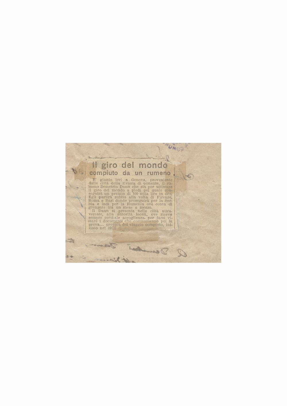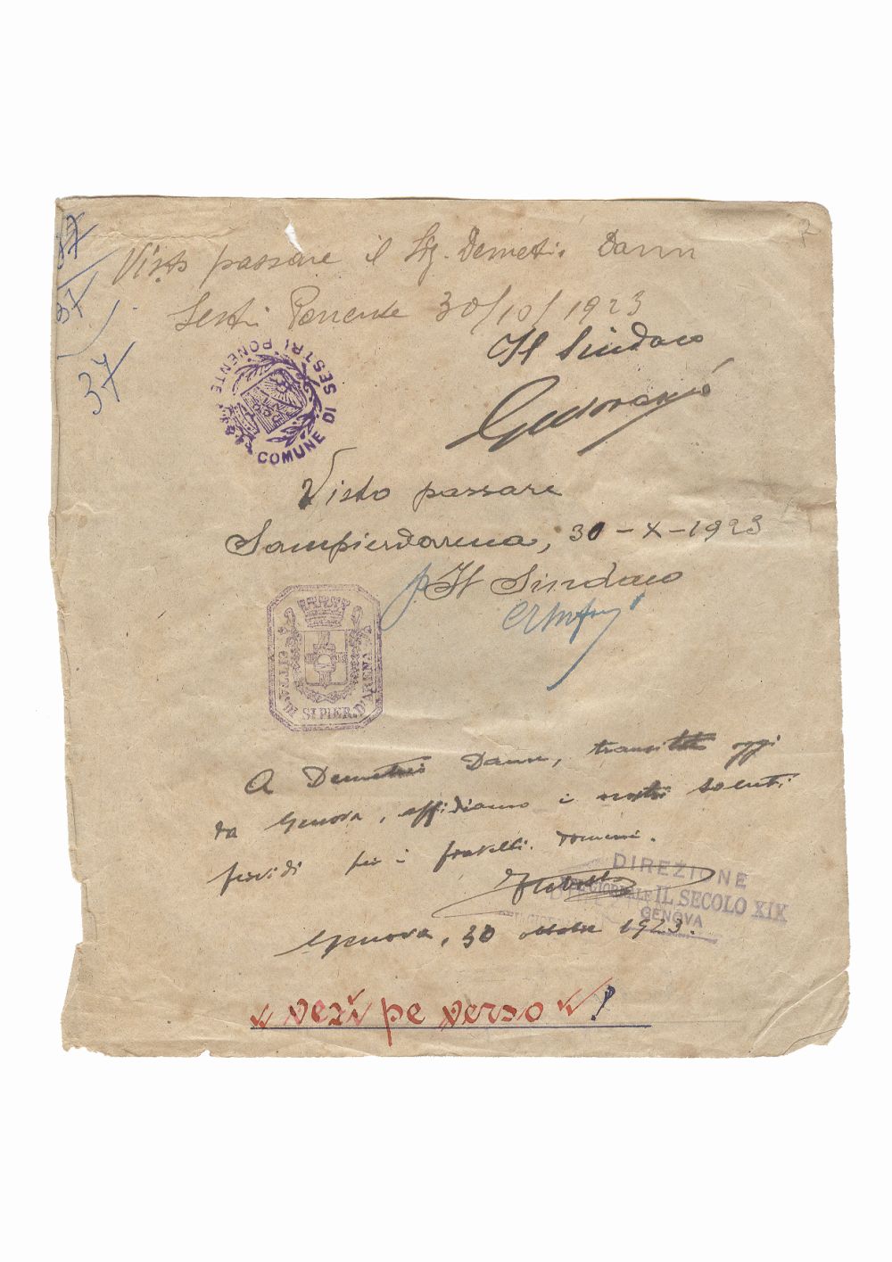 Document pivind vizita lui Dumitru Dan la redactia ziarului Il Secolo XIX, Genova si la primaria comunei Sestri Ponente, Italia. Pe verso, fragment ziar reprezentand un articol cu referiri la Dumitru Dan. Dimensiuni: 18,5 x 20,1 cm. Stare de conservare: buna, hartie ingalbenita si patata, sifonata, mici rupturi marginale. Material/tehnica: hartie, mss, tus negru, 2 stampile tus violet, 3 semnaturi. Pe verso lipit un articol din ziar cu referiri la D. Dan (tiparire, tus negru).