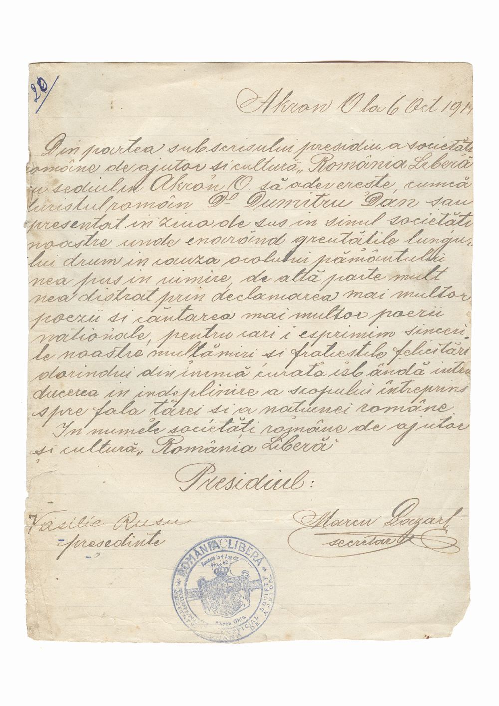Document privind vizita lui Dumitru Dan la Societatea Romania libera, Akron, Ohio, Statele Unite ale Americii. Dimensiuni: 18,5 x 24,3 cm. Stare de conservare: buna, hartie ingalbenita si patata, necesita restaurare. Material/tehnica: hartie tip dictando, mss, tus negru, 2 semnaturi, stampila rotunda - tus albastru.