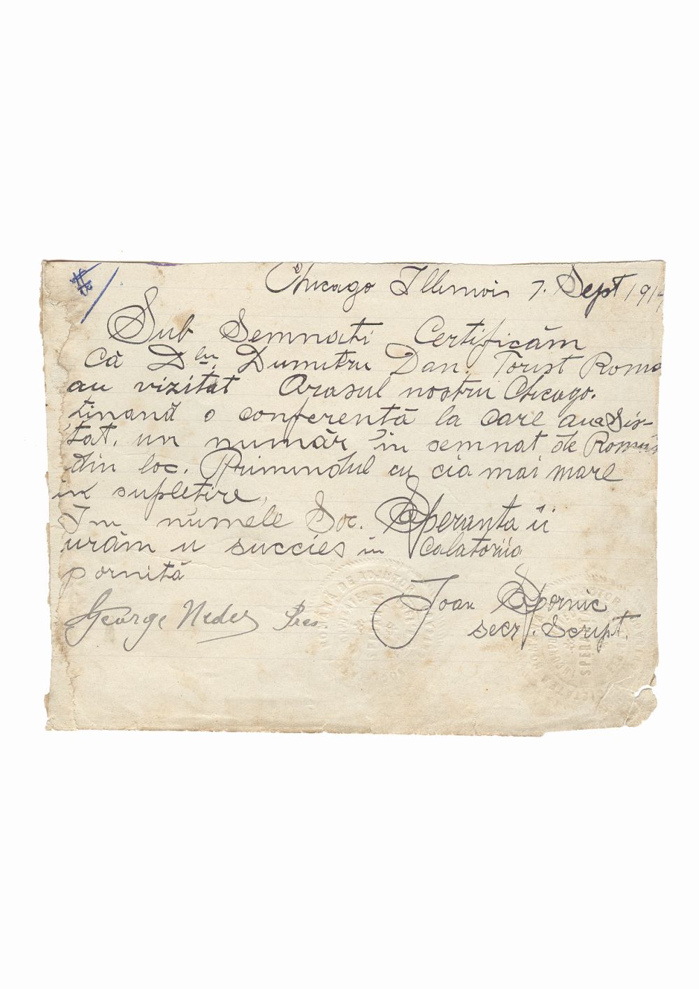 Document privind vizita lui Dumitru Dan la Societatea Romana de Ajutor Speranta" din Chicago, Illinois, Statele Unite ale Americii. Dimensiuni: 18,5 x 14,1 cm. Stare de conservare: buna, hartie ingalbenita si patata, urme de adeziv, necesita restaurare. Material/tehnica: 2 sigilii timbrate, 2 semnaturi, mss, tus negru hartie tip dictando, semneaza presedintele George Nedes, secretar Ioan Spornic.