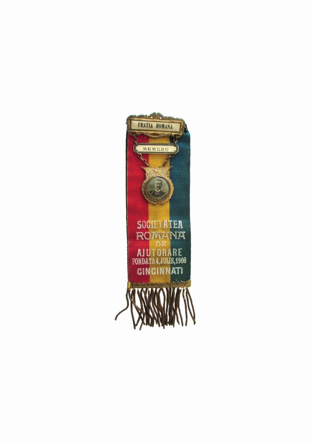 Cocarda de membru al Societatii romane de Ajutorare Fratia romana" din Cincinnati, Statele Unite ale Americii acordata lui Dumitru Dan. Dimensiuni: 21,4 x 6,4 x 3,2 cm. Stare de conservare: buna, metal usor oxidat. Material/tehnica: Metal aurit, in mijloc fotografia dr. Alexandru Vajda. Panglica tricolora, material textil, zale metalice franjuri aurii in partea de jos, Inscriptia ,,membru, in partea de sus, prindere cu ac de siguranta pe verso.