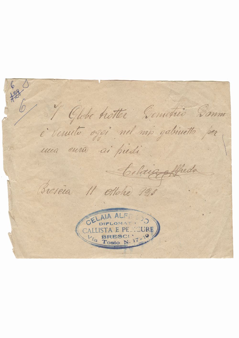 Document care atesta vizita lui Dumitru Dan la cabinetul de pedichiura al lui Celaia Alfredo Diplomato, Callista E Pedicure, din Brescia, via Tosio, Italia. Dimensiuni: 20 x 15,7 cm. Stare de conservare: buna, hartie ingalbenita si usor sifonata. Material/tehnica: hartie, mss, tus negru, stampila ovala, tus albastru, semnatura.