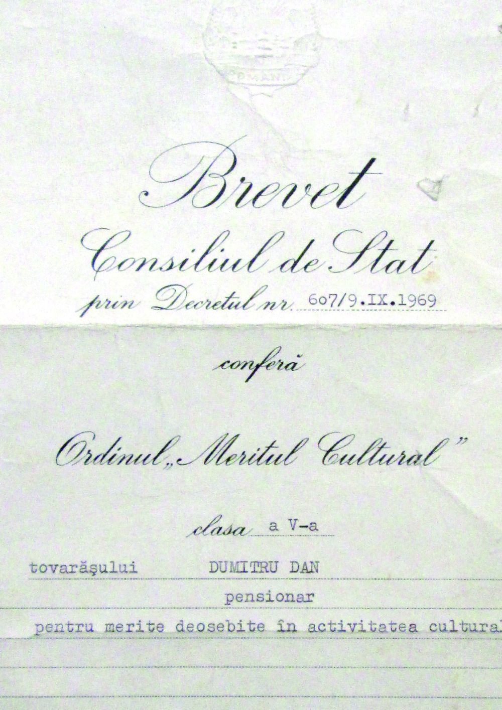 Brevet pentru Ordinul Meritul cultural, cls.V, emis de Consiliul de Stat al Republicii Socialiste Romania prin decretul nr. 607, tovarasului Dumitru Dan, pensionar, pentru merite deosebite in activitatea culturala. Semnat de Presedintele Consiliului de stat, N. Ceausescu. Dimensiuni: 21 x29,7 cm. Stare de conservare: buna, hartie ingalbenita si usor patata, urme de pliere. Material/tehnica: hartie cartonata, tiparire, tus negru, dactilografiere, mss, semnatura, stanta cu stema republicii si stampila stantata.