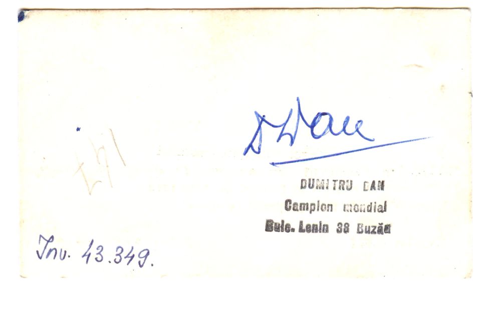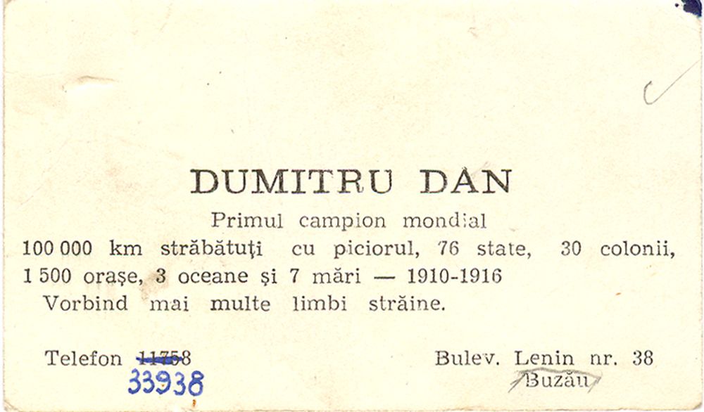 Carte de vizita care i-a apartinut lui Dumitru Dan; "DUMITRU DAN/Primul campion mondial/100.000Km. Strabatuti cu piciorul, 76 state, 30 colonii,/1500 orase, 3 oceane si 7 mari - 1910-1916/Vorbind mai multe limbi straine. Bulevardul Lenin, nr.38/Buzau". Dimensiuni: 9,6 x 5,8 cm. Stare de conservare: buna. Material/tehnica: hartie cartonata, tiparire, tus negru.
