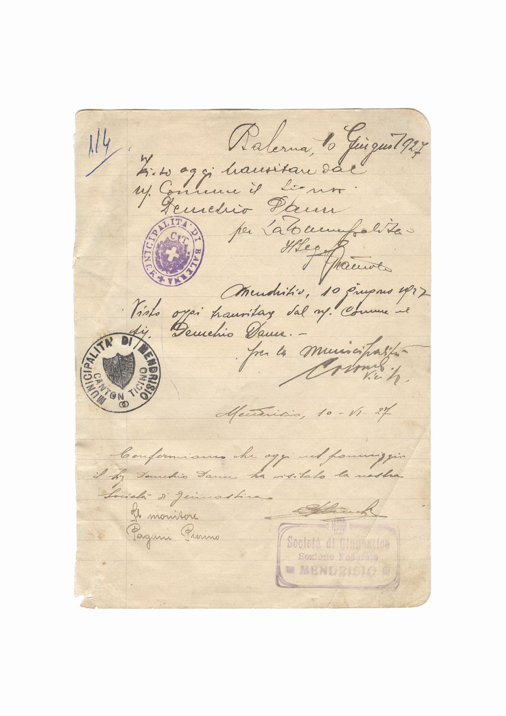 Document cu vize ce atesta prezenta lui Dumitru Dan in orasul Balerna si vizita la Primaria si Societatea de gimnastica din Mendrisio, Italia. Dimensiuni: 14 x 20 cm. Stare de conservare: buna, hartie ingalbenita. Material/tehnica: Hartie tip dictando, mss, tus negru, 3 semnaturi, 3 stampile.