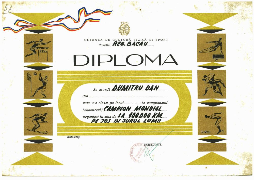 Diploma emisa de Uniunea de Cultura Fizica si Sport, Consiliul Regional Bacau, se acorda lui Dumitru Dan, Campion mondial la 100.000 km pe jos in jurul lumii, Bacau. Dimensiuni: 29,6 x 20,5 cm. Stare de conservare: buna. Material/tehnica: hartie cartonata, tiparire, tus negru, mss, carioca neagra, stampila rotunda tus rosu, semnatura pix culoare verde.
