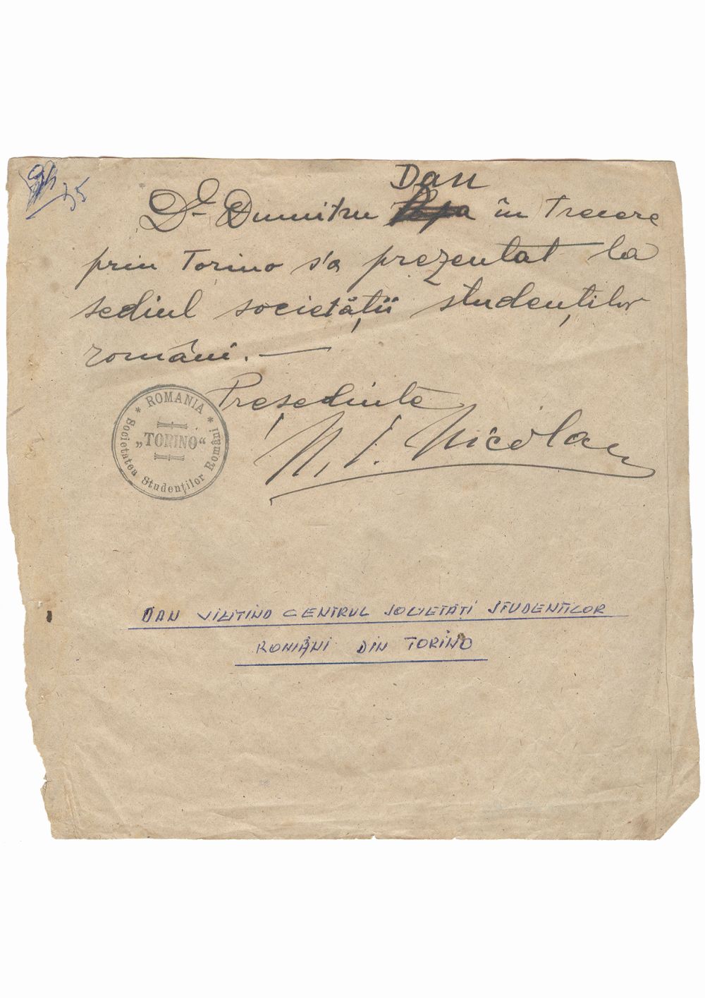 Certificat privind prezenta lui Dumitru Dan la sediul Societatii Studentilor Romani din Torino, Italia. Dimensiuni: 20,2 x 20,2 cm. Stare de conservare: buna, hartie ingalbenita. Material/tehnica: hartie, mss, tus negru, 1 stampila rotunda, 1 semnatura presedinte N. I. Nicolae.