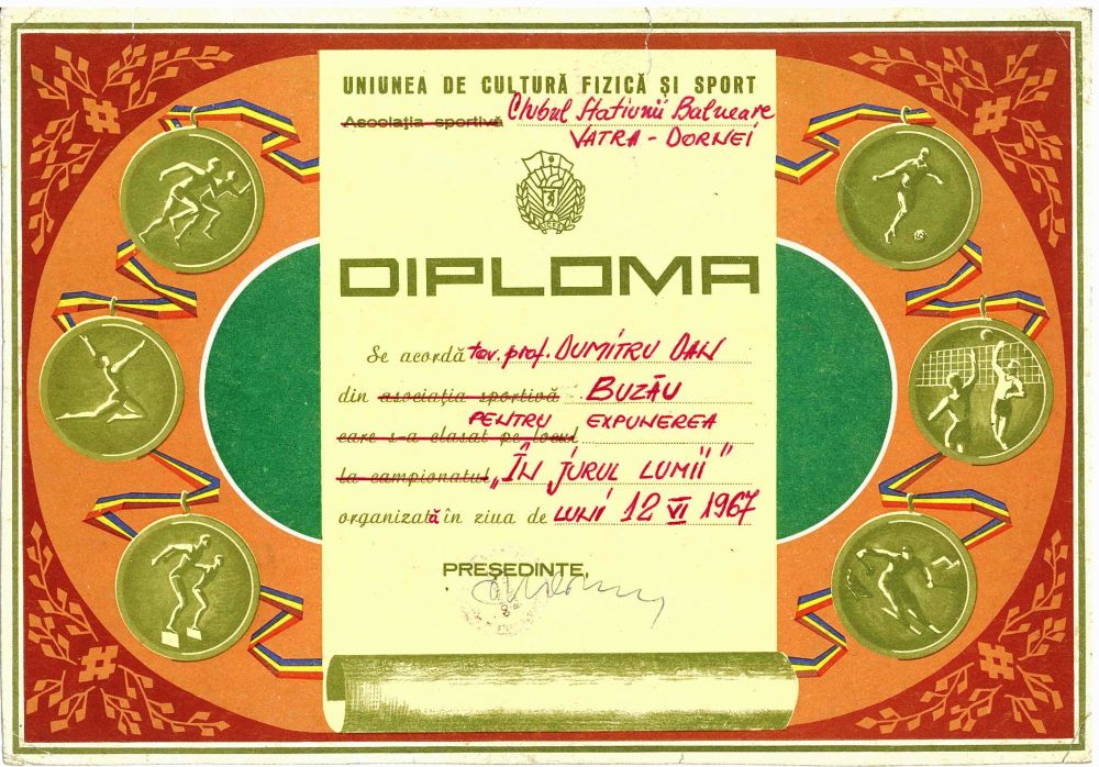Diploma emisa de Uniunea de Cultura Fizica si Sport, Clubul Statiunii Balneare Vatra-Dornei acorda profesorului Dumitru Dan, din Buzau, pentru expunerea in jurul lumii. Dimensiuni: 28,7 x 19,9 cm. Stare de conservare: buna. Material/tehnica: hartie cartonata, tiparire, tus negru, mss, pix culoare rosie, semnatura, stampila rotunda, tus violet.