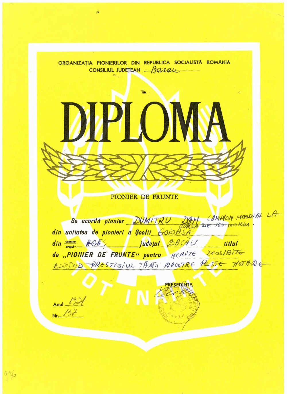 Diploma nr. 157, Pionier de Frunte emisa de Organizatia pionierilor din R.S.R., Consiliul Judetean Bacau, se acorda lui Dumitru Dan, campion mondial la cursa de 100.000 km, scoala generala Gaioasa, judetul Bacau. Dimensiuni: 21,4 x 29 cm. Stare de conservare: buna. Material/tehnica: hartie cartonata, tiparire, tus negru, mss, cerneala albastra, semnatura, stampila rotunda, tus negru.
