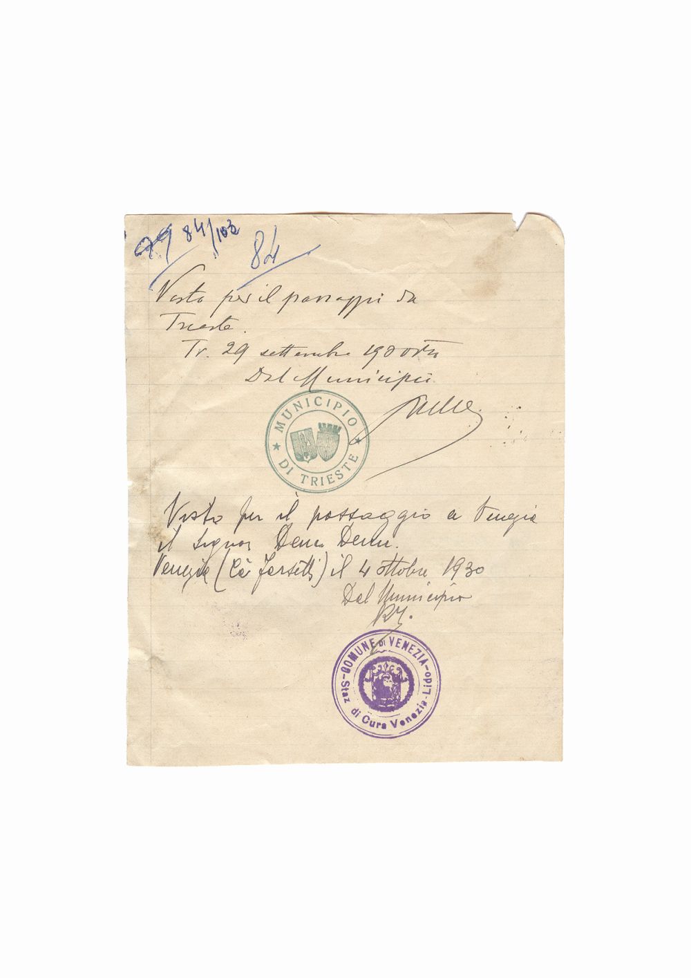 Document care atesta prezenta lui Dumitru Dan in municipiile Trieste si Venetia, Italia. Dimensiuni: 13,1 x 16,7 cm. Stare de conservare: buna, prezinta mici pete. Material/tehnica: hartie tip dictando, mss, tus negru, 2 semnaturi, 2 stampile rotunde, tus violet si verde.