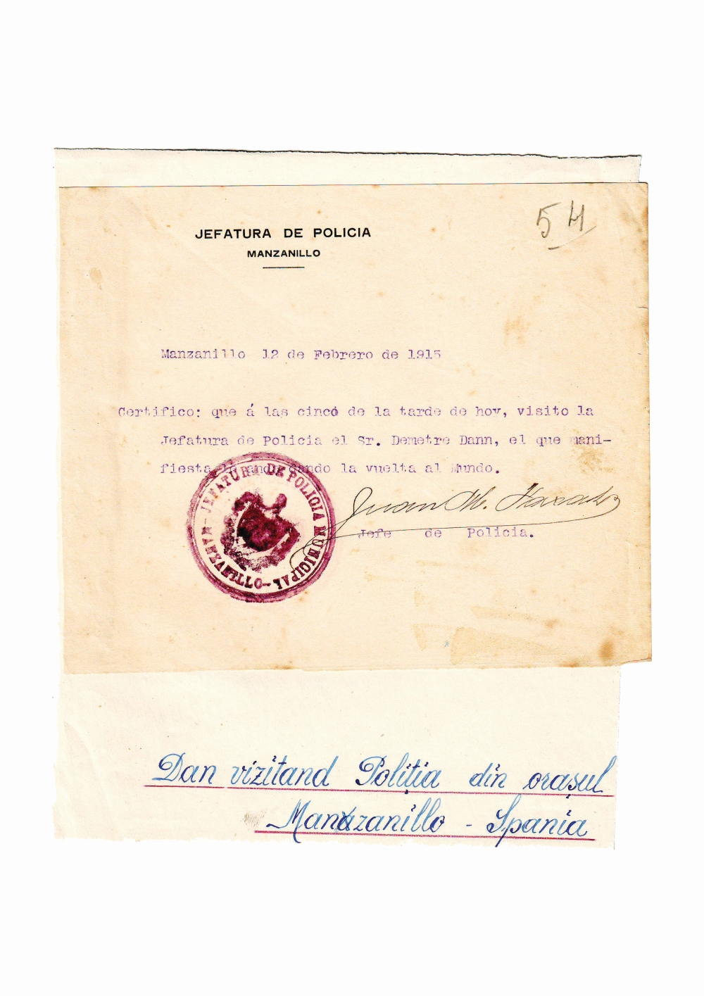 Document care atesta vizita lui Dumitru Dan la Politia din Orasul Manzanillo, semneaza seful politiei Juan M. (Jaxar), Cuba. Dimensiuni: 17,5 x 14,2 cm. Stare de conservare: Hartie ingalbenita, patata, urme de adeziv, uzura functionala, document lipit pe o coala de hartie. Material/tehnica: hartie, dactilografiere, antet tiparit, stampila rotunda tus violet.