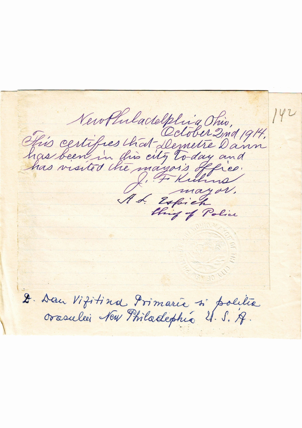 Document care atesta vizita lui Dumitru Dan la Primaria si Politia orasului New Philadelphia, Statele Unite ale Americii. Dimensiuni: 17,4 x 13,7 cm . Stare de conservare: hartie ingalbenita, patata, urme de adeziv si de mucegai, document lipit pe o coala de hartie . Material/tehnica: hartie dictando, mss, tus negru, timbru sec .