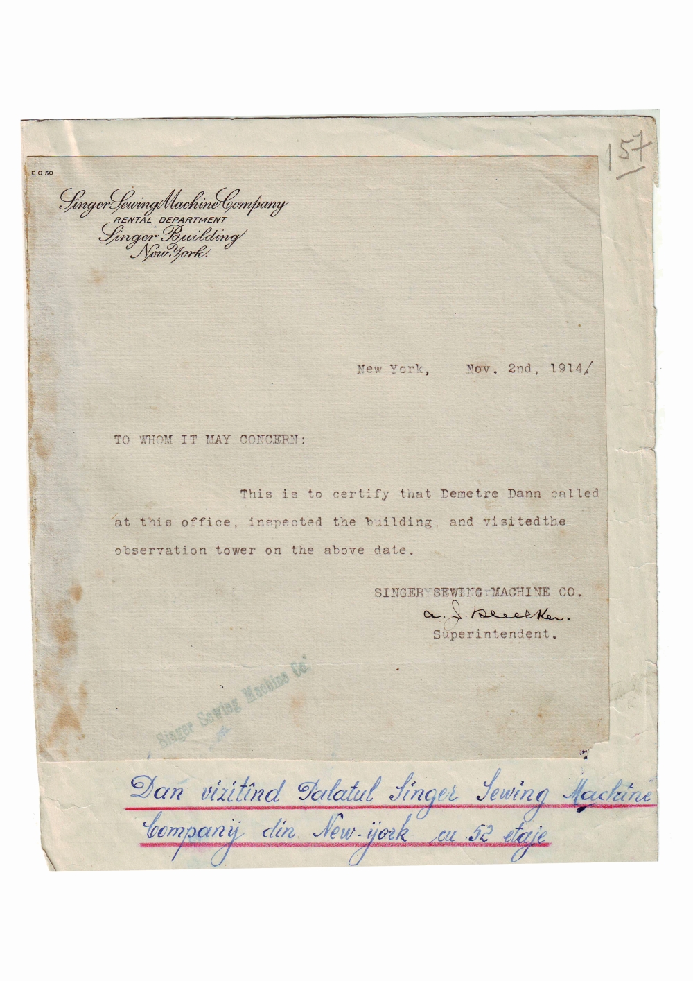 Document care atesta vizita lui Dumitru Dan la Palatul Singer Sewing Machine Company, New York, Statele Unite ale Americii. Dimensiuni:17,3 x 18,2 cm . Stare de conservare: hartie ingalbenita, patata, urme de adeziv si de mucegai, lipsa material 0,5 cm colt dr. jos, document lipit pe o coala de hartie. Material/tehnica: hartie filigran, dactilografiere, tus negru, antet tiparit.