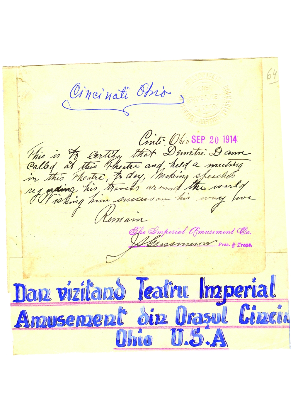 Document care atesta vizita lui Dumitru Dan la Teatrul Imperial Amusement din orasul Cincinnati, Ohio, Statele Unite ale Americii. Dimensiuni: 15,5 x 18,3 cm. Stare de conservare: hartie ingalbenita, patata, urme de adeziv si de mucegai, urma de pliere, document lipit pe o coala de hartie . Material/tehnica: hartie dictando, mss, tus negru, timbru sec.