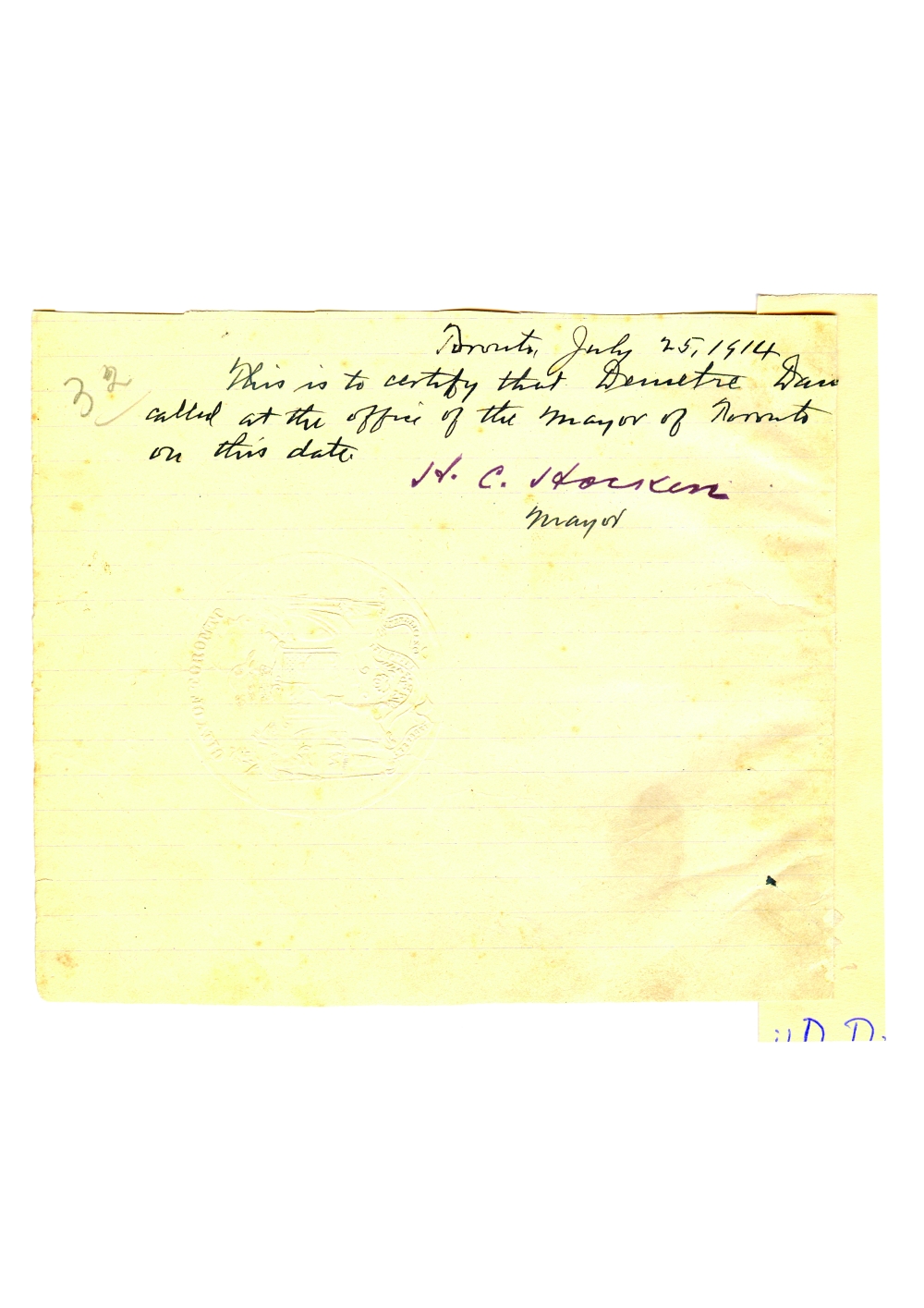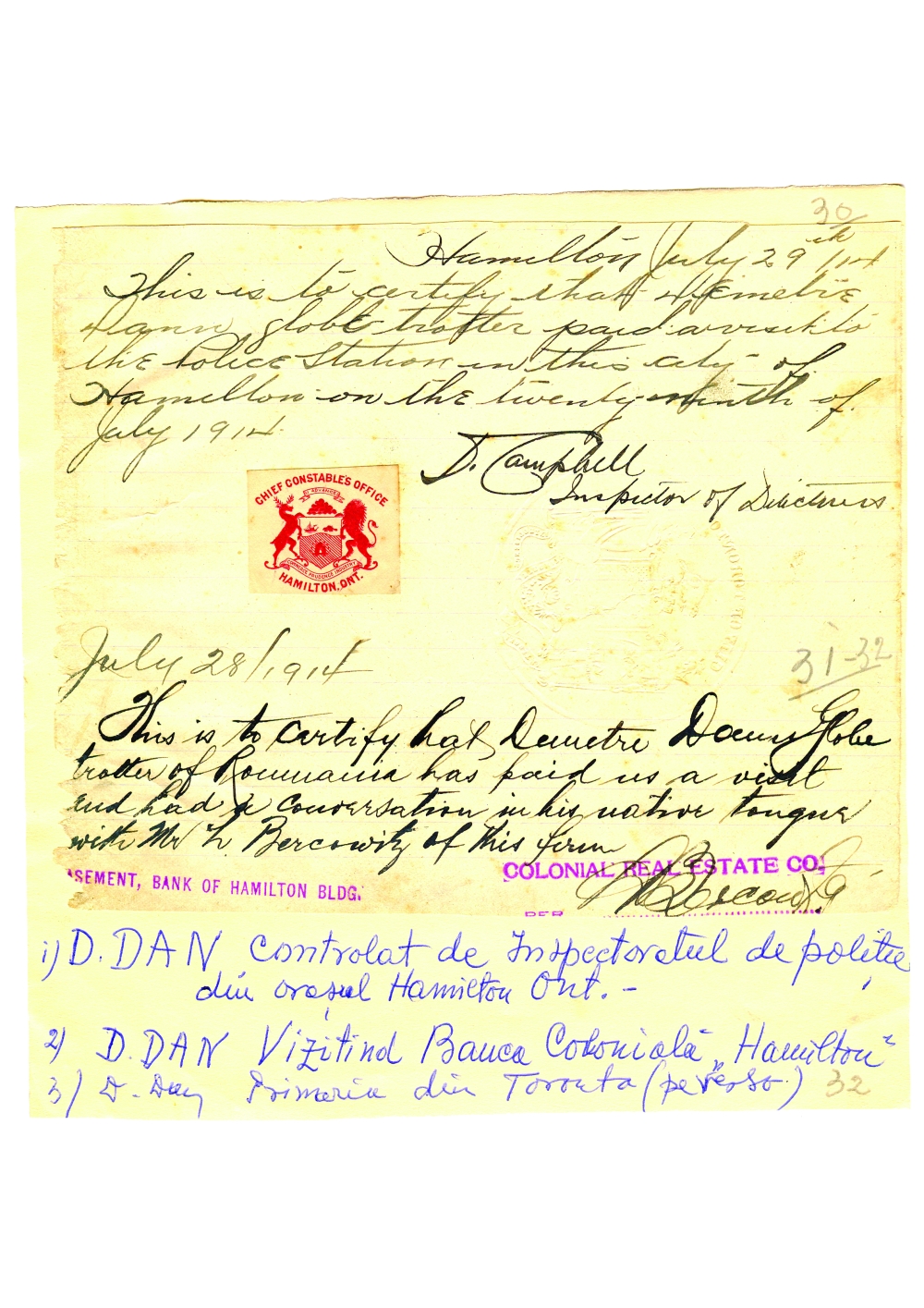 Document care atesta vizita lui Dumitru Dan la Banca Coloniala, Primaria orasului Hamilton si Primaria orasului Toronto, Canada. Dimensiuni: 18,8 x 28,2 cm. Stare de conservare: hartie ingalbenita, patata, urme de adeziv si de mucegai, urma de pliere, mici rupturi marginale, document lipit pe o coala de hartie. Material/tehnica: hartie dictando, mss, tus negru, 3 stampile, 6 semnaturi, 2 timbre seci.