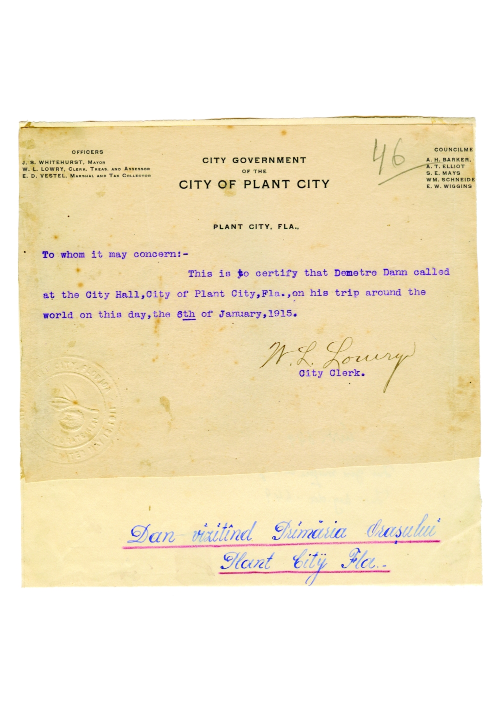 Document care atesta vizita lui Dumitru Dan la Primaria orasului Plant City, Florida, Statele Unite ale Americii , semneaza secretarul primariei W.L. Lowry. Dimensiuni: 19 x 14 cm. Stare de conservare: hartie ingalbenita, patata, urme de adeziv si de mucegai, document lipit pe o coala de hartie. Material/tehnica:hartie filigran, dactilografiere, tus violet, antet tiparit tus negru, timbru sec .