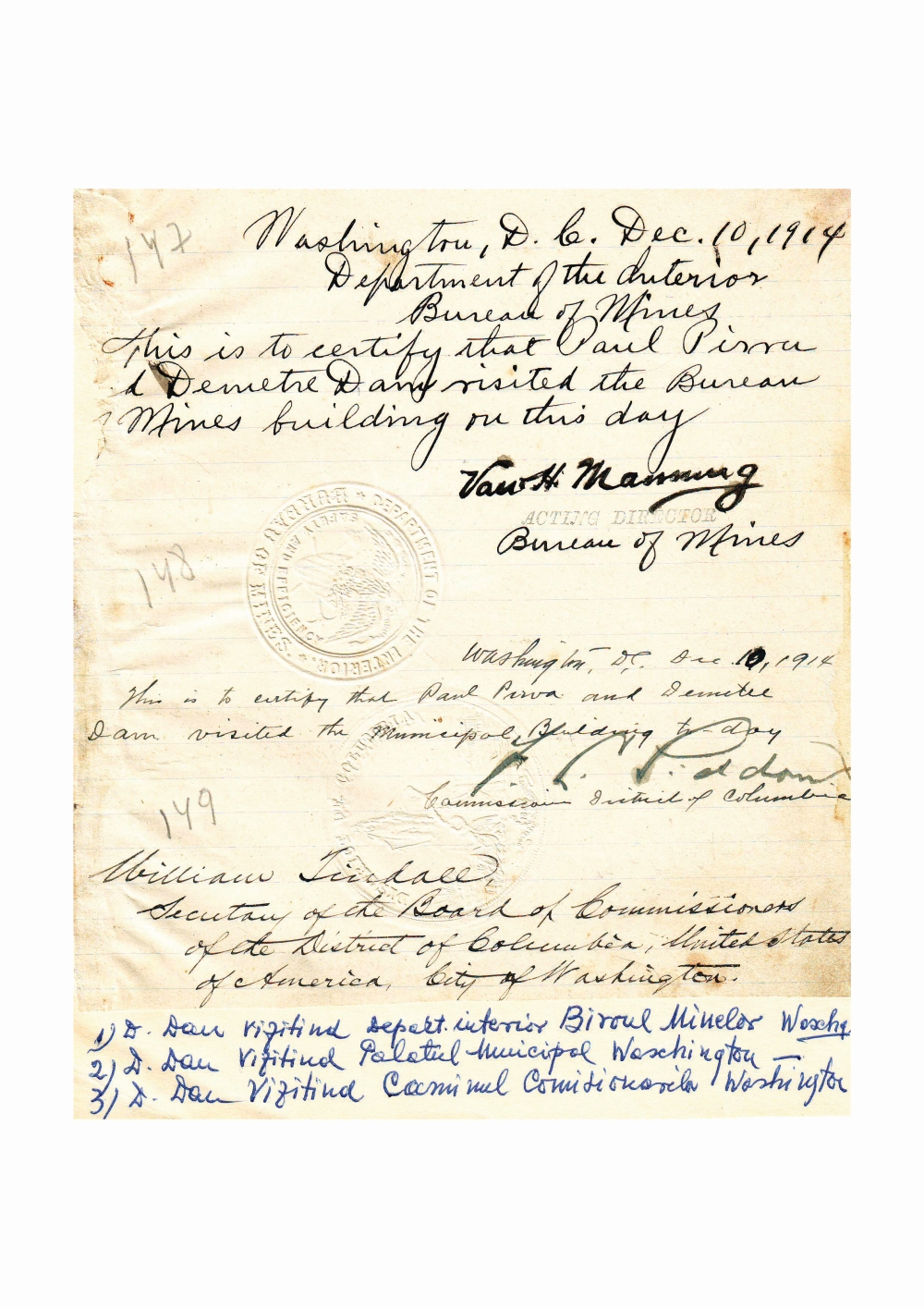 Document care atesta vizita lui Dumitru Dan la Departamentul Interior al Biroului Minelor, la Palatul Municipal Washington si la Comitetul Comisionarilor din Washington D.C, Statele Unite ale Americi. Dimensiuni: 17,6 x 18,6 cm. Stare de conservare: hartie ingalbenita, patata, urme de adeziv si de mucegai, document lipit pe o coala de hartie. Material/tehnica: hartie dictando, mss, tus negru, 4 semnaturi, 2 timbre seci.