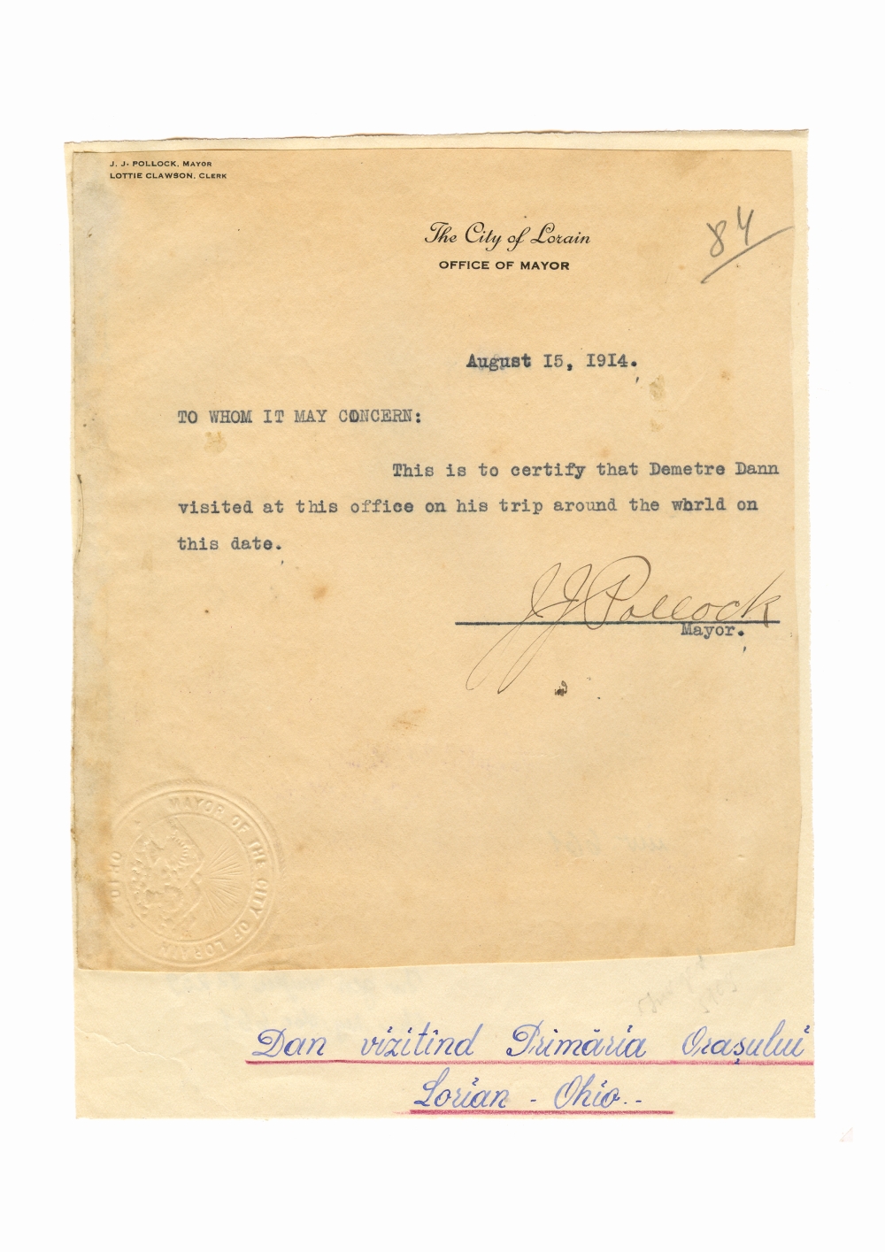 Document care atesta vizita lui Dumitru Dan la Primaria orasului Lorain, Ohio, Statele Unite ale Americii. Dimensiuni: 17 x 19,4 cm. Stare de conservare: hartie ingalbenita, patata, urme de adeziv si de mucegai, document lipit pe o coala. Material/tehnica: hartie filigran, dactilografiere, tus negru, antet tiparit, semnatura.