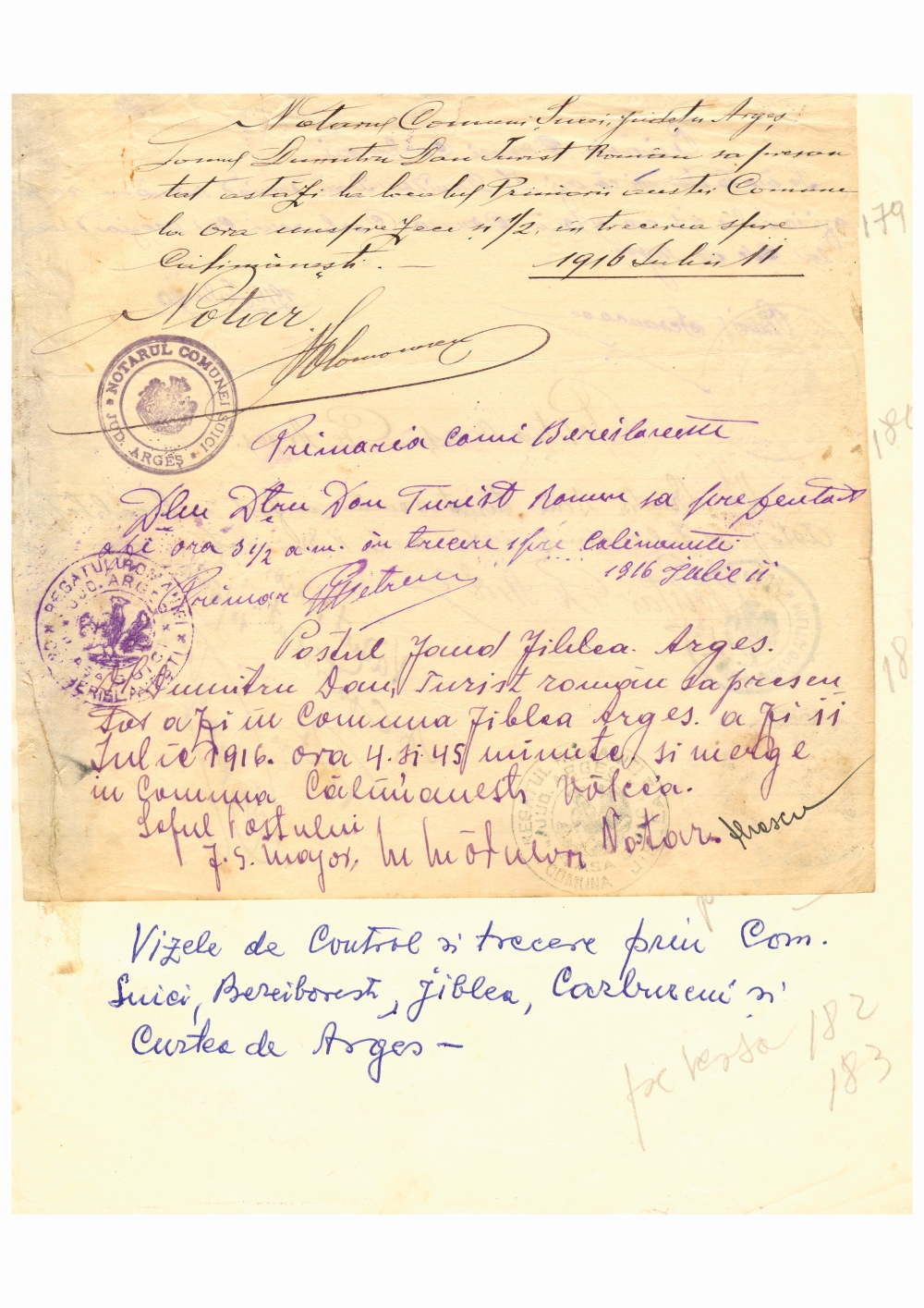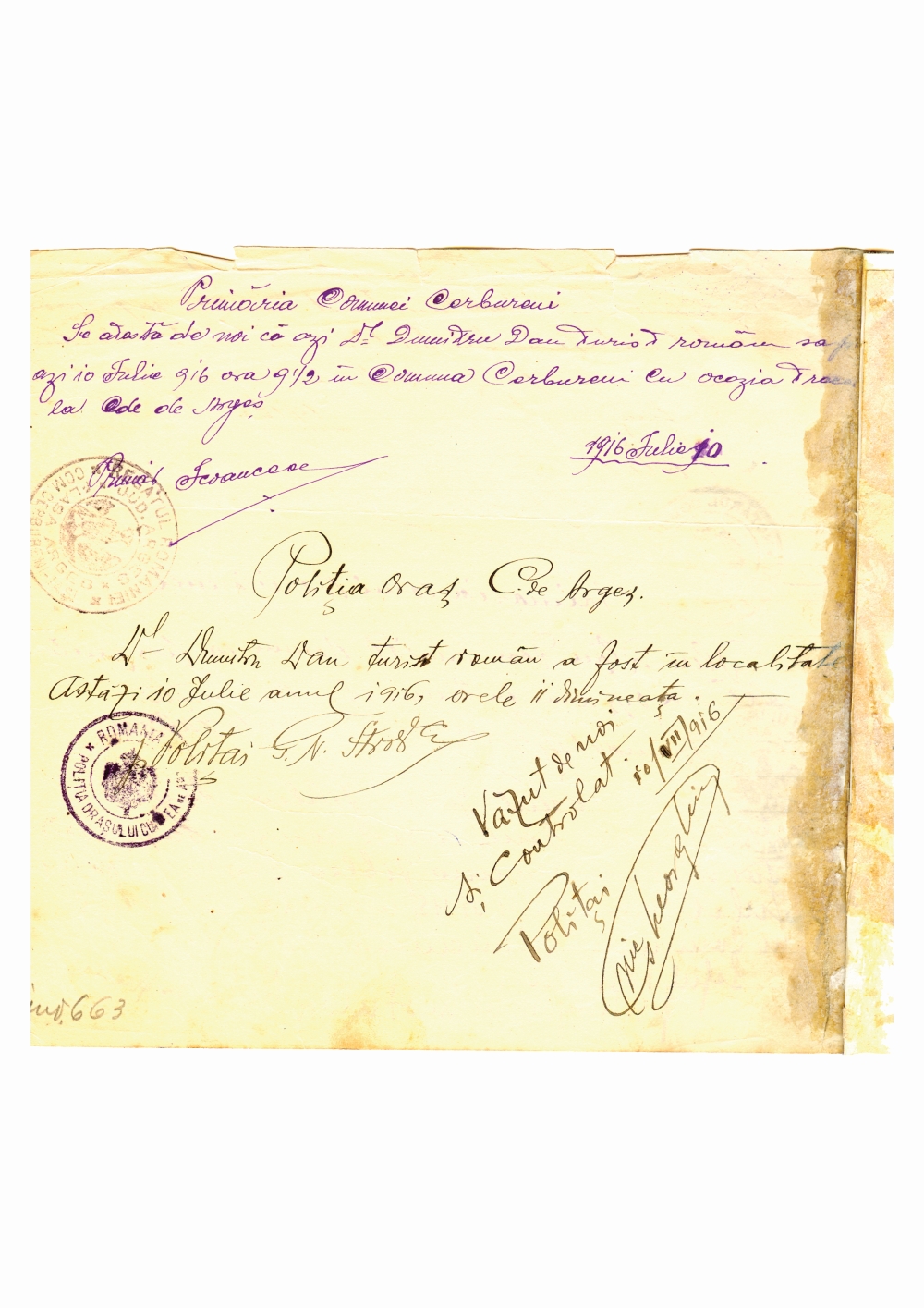 Document care atesta vizita lui Dumitru Dan la Politia orasului Curtea de Arges si comuna Carburani, comuna Suici, Bereiboresti si Jiblea, Romania. Dimensiuni: 19,2 x 18,2 cm. Stare de conservare: hartie ingalbenita, patata, urme de adeziv si de mucegai, document lipit pe o coala. Material/tehnica: hartie dictando, mss, tus negru si violet, 3 semnaturi, 3 stampile.