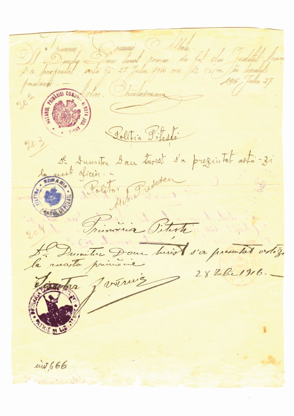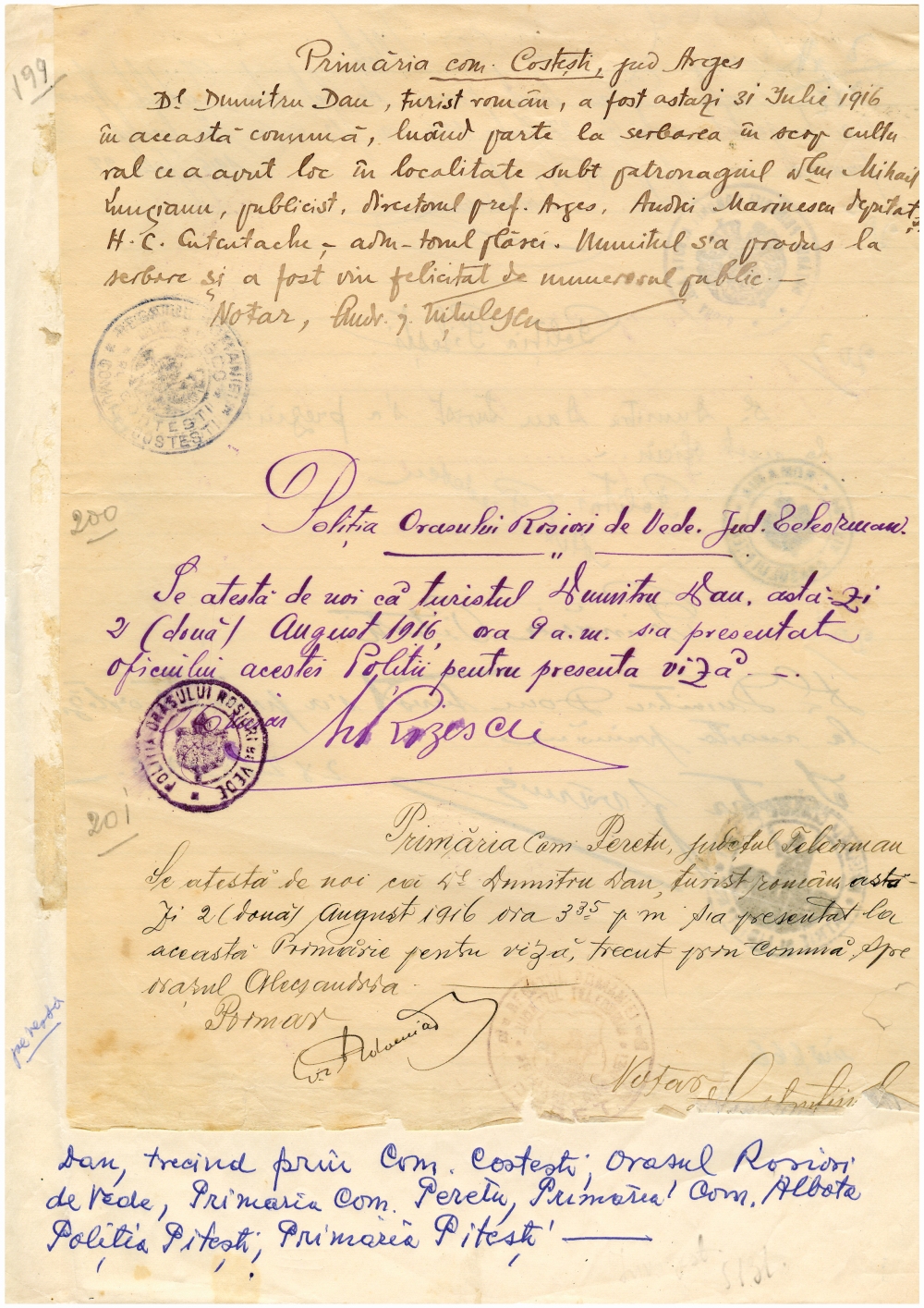 Document care atesta vizita lui Dumitru Dan la diverse institutii din orasul Rosiorii de Vede si Pitesti, Romania. Dimensiuni: 19,3 x 25 cm . Stare de conservare: hartie ingalbenita, patata, urme de adeziv si de mucegai, document lipit pe o coala. Material/tehnica: hartie dictando, mss, tus negru si violet, 4 semnaturi si 3stampile.