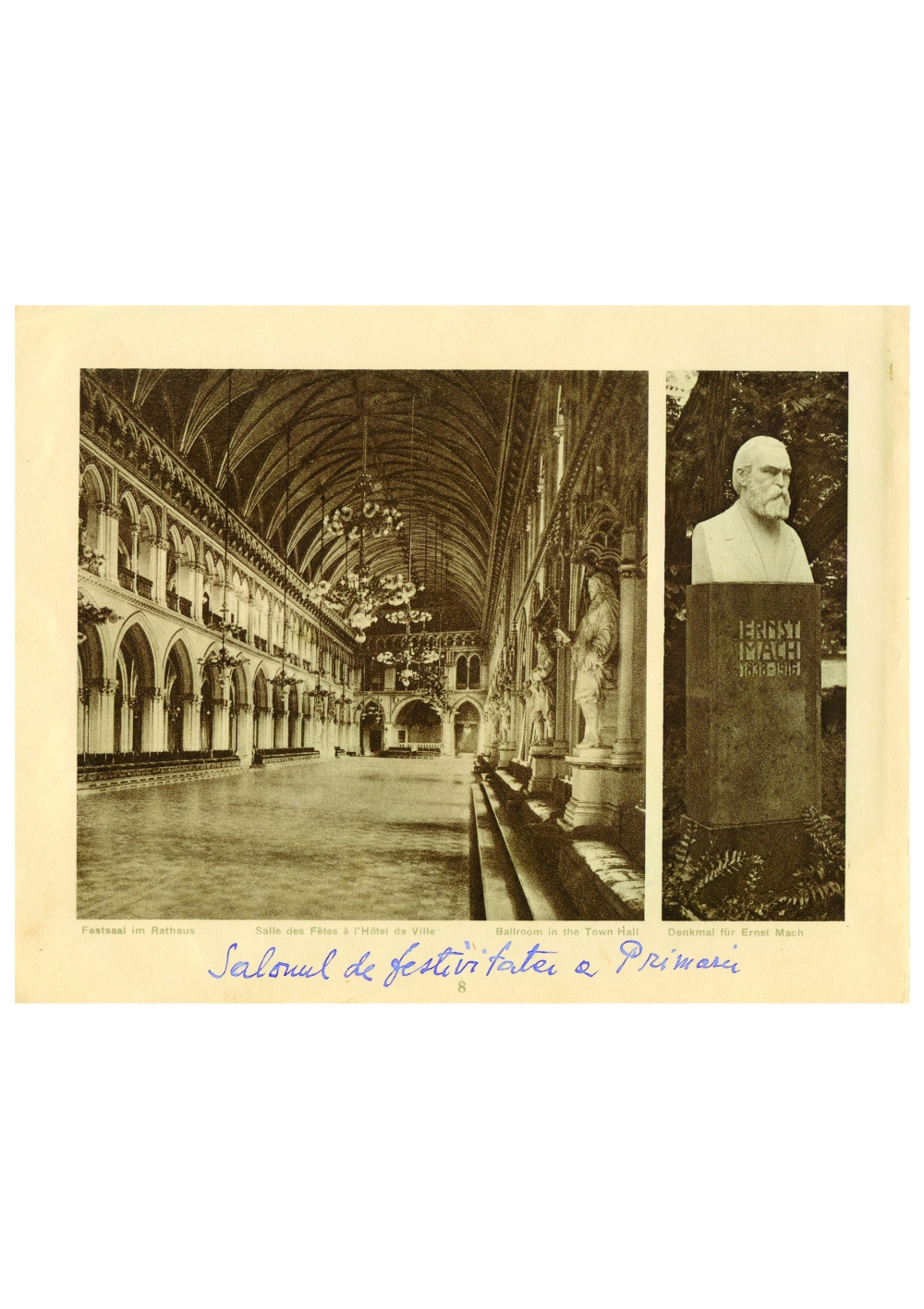 Reproducere foto, salonul de festivitati al Primariei din Viena si statuia lui Ernst Mach, Austria; i-a apartinut lui Dumitru Dan. Dimensiuni: 21 x 16 cm. Stare de conservare: hartie ingalbenita, usor patata, urme de adeziv si de mucegai, fila de album lipita pe o coala. Material/tehnica: hartie, tiparire.