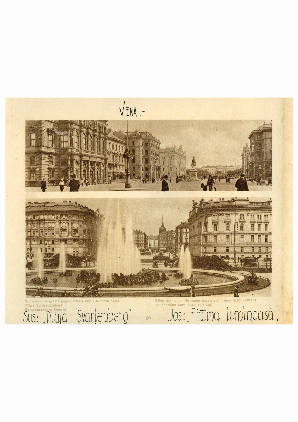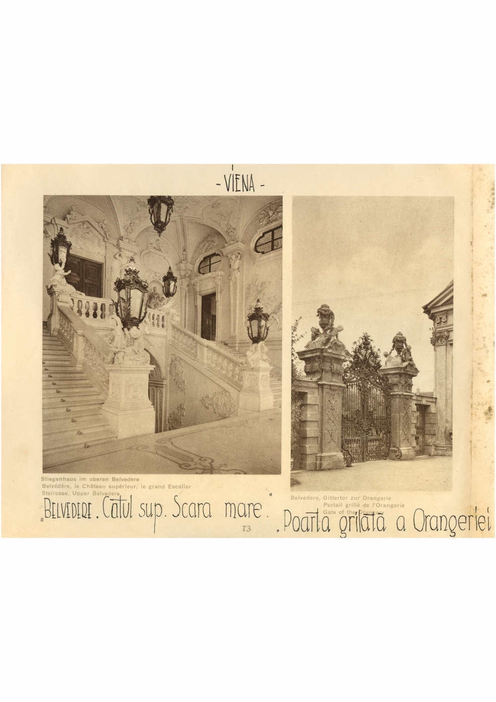Reproducere foto, Fantana Luminoasa si Poarta grilata a Orangeriei, Austria; i-a apartinut lui Dumitru Dan. Dimensiuni: 21,4 x 16 cm. Stare de conservare: hartie ingalbenita,fragilizata, pete de mucegai si urme de adeziv. Material/tehnica: hartie, fotografiere, tiparire, sepia, tus.