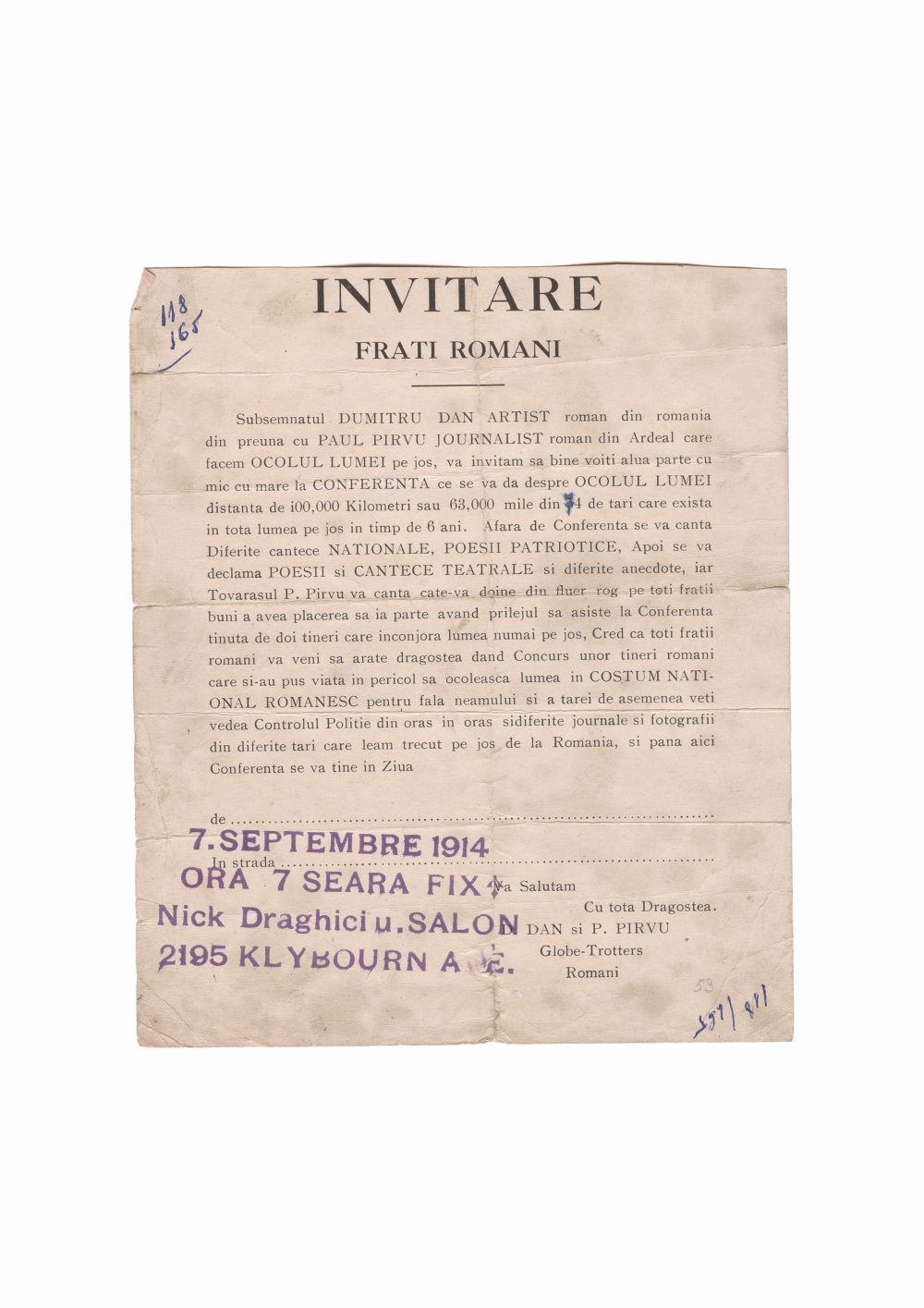 Document invitatie din partea lui Dumitru Dan si lui Paul Pirvu catre romanii din Chicago - pentru a participa la conferinta Ocolul lumii pe jos in Chicago, Statele Unite ale Americii , la Salonul Nick Draghiciu. Dimensiuni: 14,8 x 17,6 cm. Stare de conservare: buna, hartie ingalbenita, urme de pliere. Material/tehnica: hartie usor cartonata, roz, tiparire, tus negru si violet.