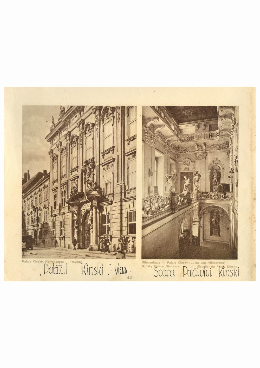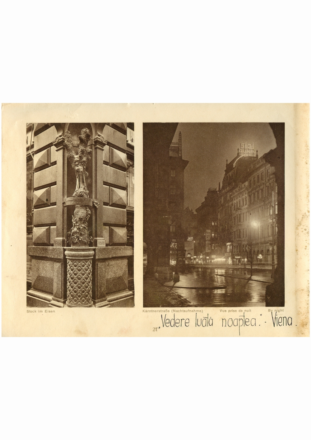 Reproducere foto, Palatul Kinsky si vedere noaptea din Viena, Austria; i-a apartinut lui Dumitru Dan. Dimensiuni: 21,1 x 16 cm . Stare de conservare: hartie ingalbenita,fragilizata, pete de mucegai si urme de adeziv. Material/tehnica: hartie, fotografiere, tiparire, sepia, tus .