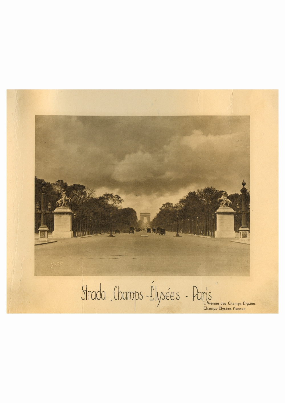 Reproducere foto, Champs Elysees, Paris, Franta; i-a apartinut lui Dumitru Dan. Dimensiuni: 21 x 16,7 cm. Stare de conservare: hartie ingalbenita, fragilizata, urme de adeziv, pete de mucegai si de origine necunoscuta. Material/tehnica: hartie, fotografiere, tiparire alb-negru, tus.