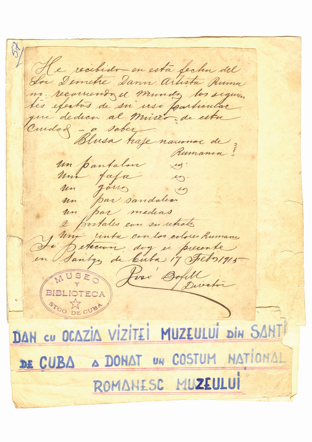 Document prin care se atesta vizita lui Dumitru Dan pe la Muzeul si Biblioteca din Santiago de Cuba, Cuba. Dimensiuni: 15,5 x 18,2 cm. Stare de conservare: hartie ingalbenita, fragilizata, urme de adeziv, pete de mucegai si de origine necunoscuta. Material/tehnica: hartie dictando, mss, tus negru, semnatura mss, stampila ovala.