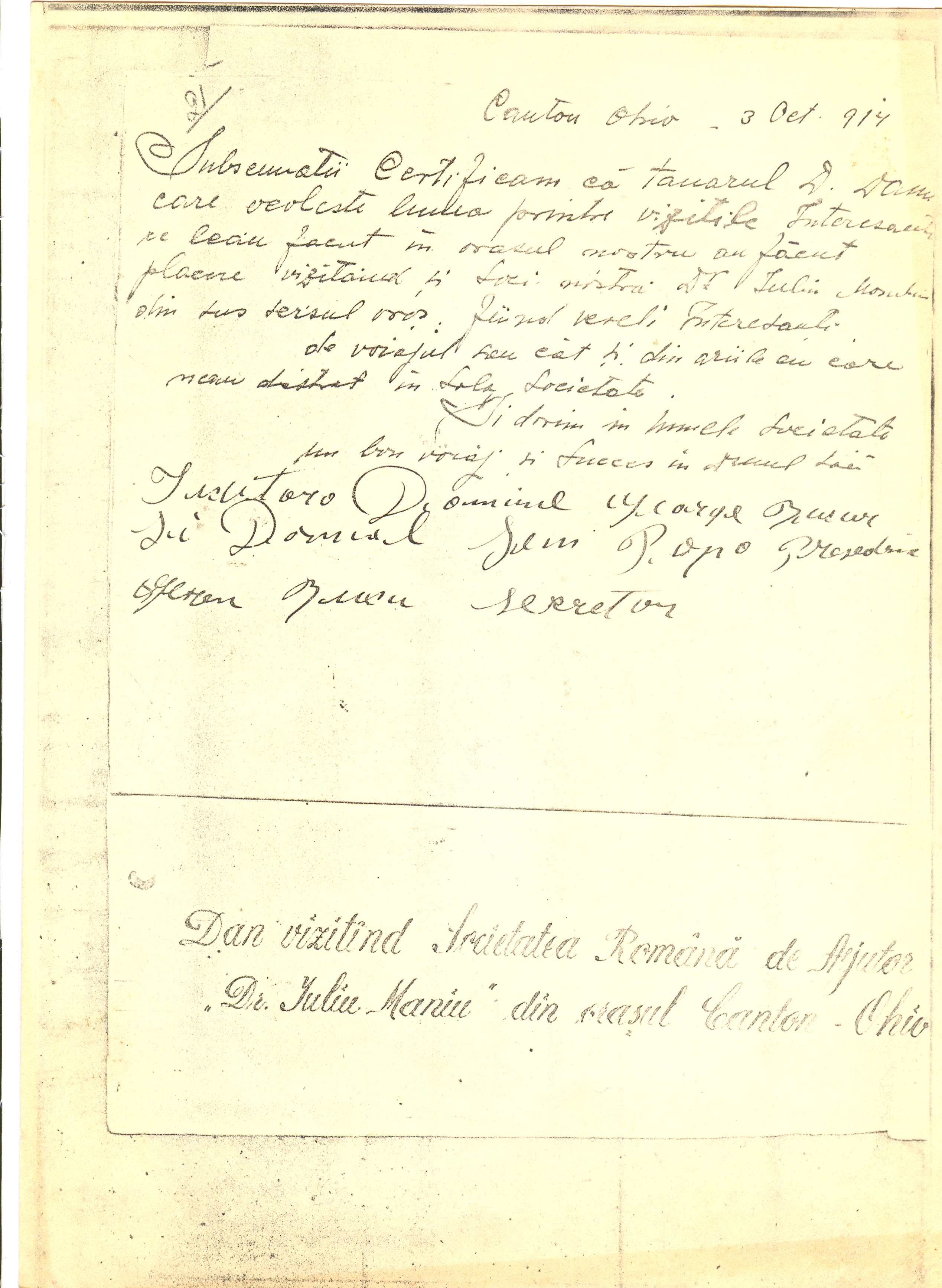 Fotocopie a unui document prin care se atesta vizita lui Dumitru Dan la Societatea Romana de Ajutor Dr. Iuliu Maniu din Canton, Ohio, Statele Unite ale Americii. Dimensiuni: 21 x 29,5 cm. Stare de conservare: hartie usor ingalbenita, uzura functionala. Material/tehnica: hartie, fotocopiere, alb- negru.