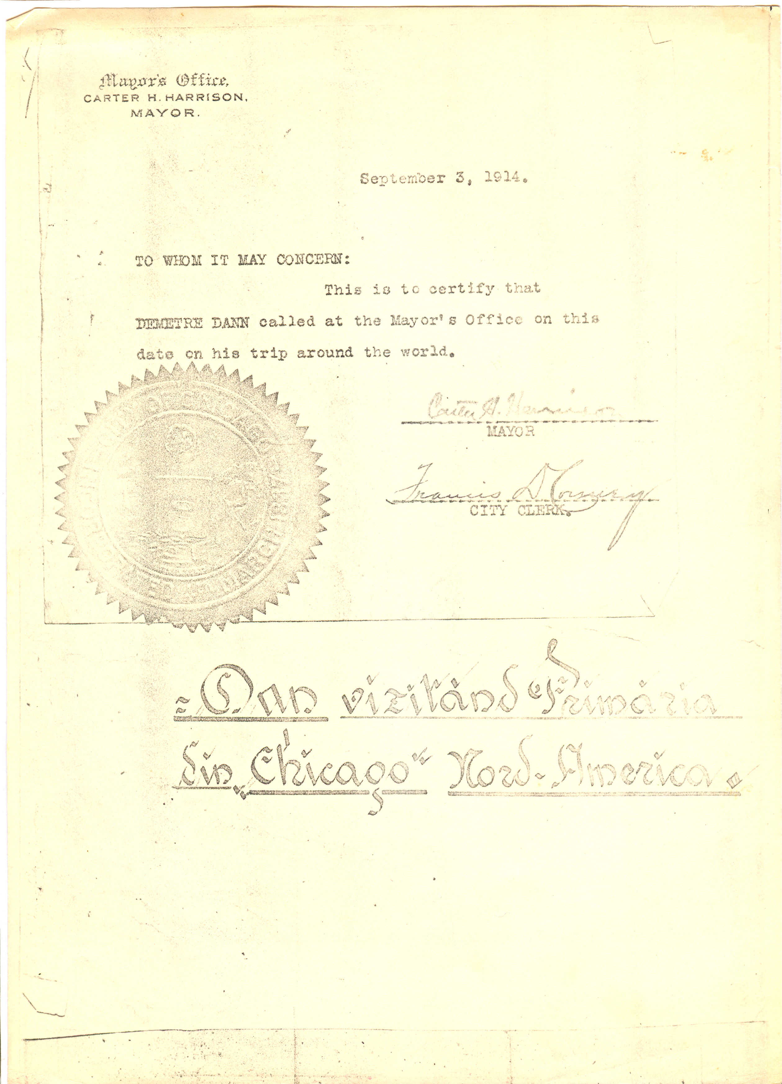 Fotocopie a unui document prin care se atesta vizita lui Dumitru Dan la Primaria din Chicago, Statele Unite ale Americii. Dimensiuni: 21 x 29,5 cm. Stare de conservare: hartie usor ingalbenita, uzura functionala. Material/tehnica: hartie, fotocopiere, alb- negru.