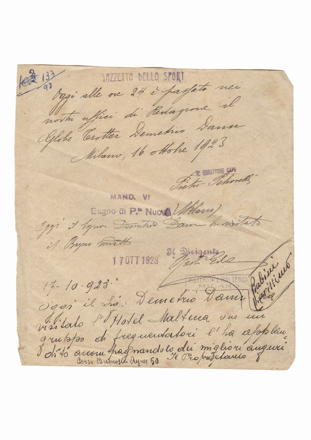 Document prin care se certifica vizita lui Dumitru Dan la ziarul Gazzetta dello Sport, la Baia Publica din Piata Nuovo; la hotelul si restaurantul Maltecca, din Milano, Italia. Dimensiuni: 18,6 x 20,1 cm. Stare de conservare: buna, hartie ingalbenita si patata, urme de adeziv. Material/tehnica: hartie, mss, tus negru, 3 semnaturi .