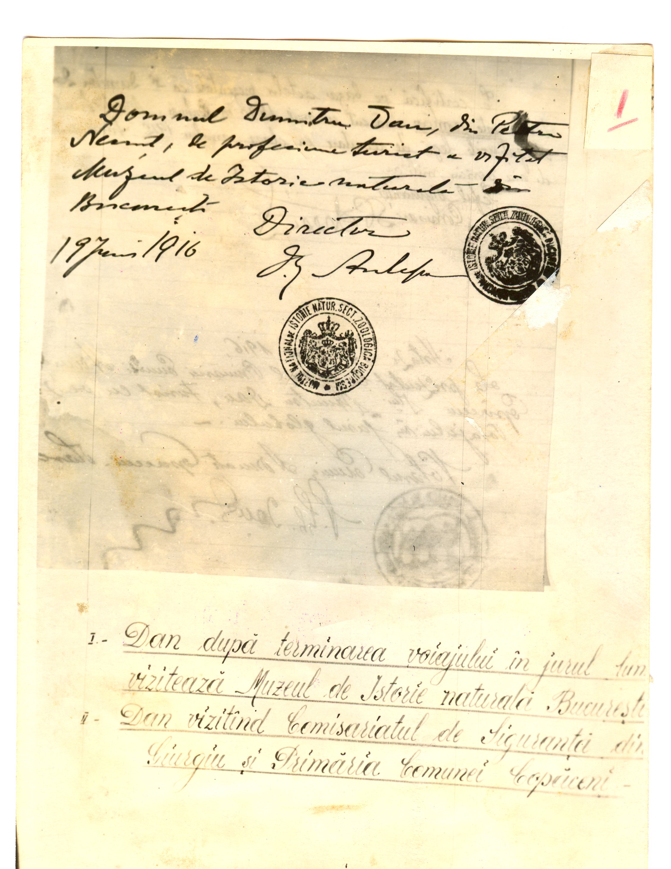 Fotocopie a unui document prin care se atesta vizita lui Dumitru Dan la Muzeul de Istorie Naturala din Bucuresti, Romania. Dimensiuni: 15 x 21 cm. Stare de conservare: hartie ingalbenita, fragilizata. Material/tehnica: hartie, fotografiere, tiparire alb-negru.