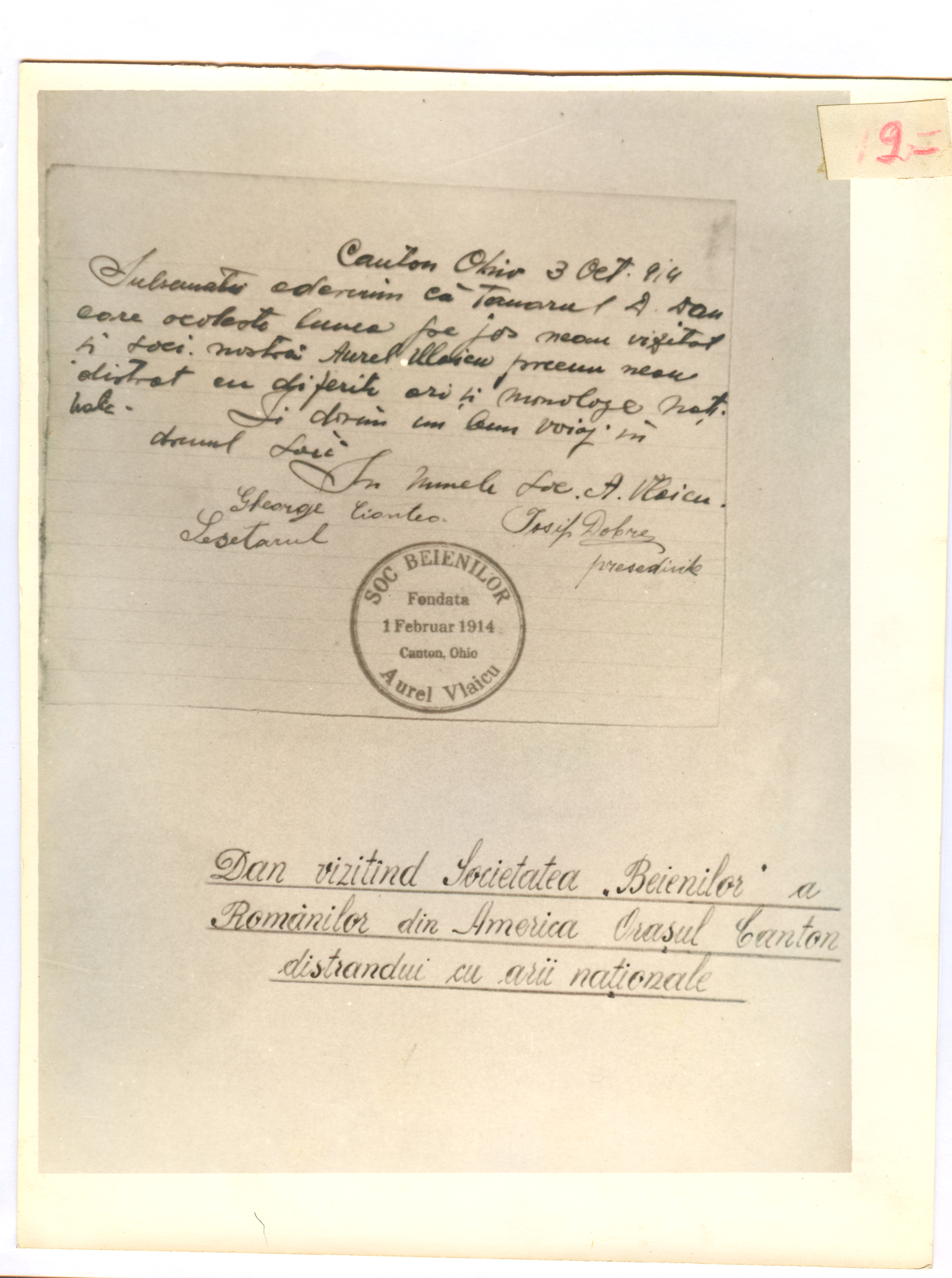 Fotocopie a unui document prin care se atesta vizita lui Dumitru Dan pe la Societatea Beienilor a romanilor din America, orasul Canton, Ohio, Statele Unite ale Americii. Dimensiuni: 29,5 x 21 cm. Stare conservare: buna. Material/tehnica: hartie, mss , tus negru, fotocopiere.