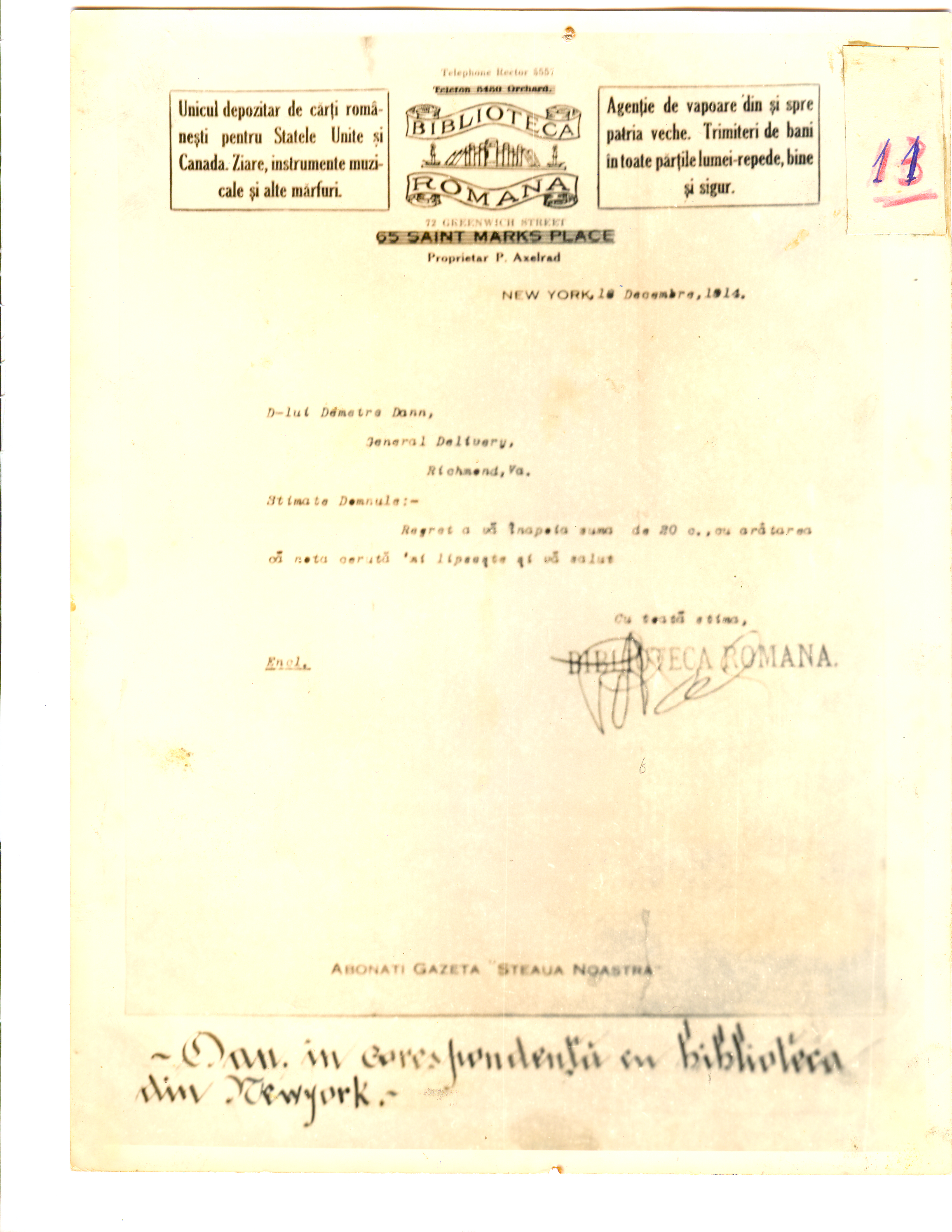Fotocopie a unui document prin care se atesta vizita lui Dumitru Dan pe la Biblioteca Romana din New York, Statele Unite ale Americii. Dimensiuni: 29,5 x 21 cm. Stare conservare: buna. Material/tehnica: hartie, mss, tus negru, fotocopiere.