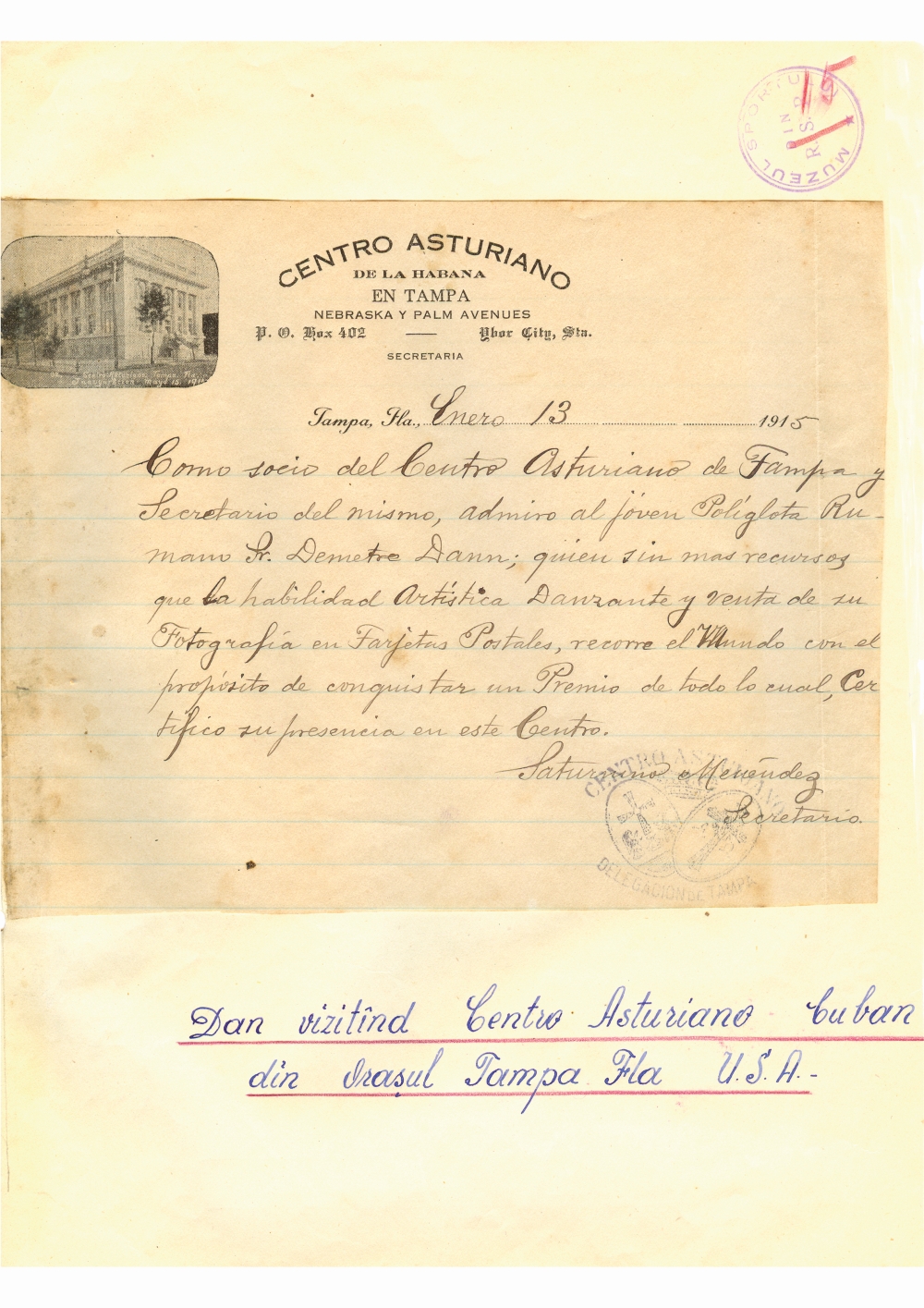 Document prin care se atesta vizita lui Dumitru Dan prin Tampa (Centuro Asturiano), Florida, Statele Unite ale Americii. Dimensiuni: 19,8 x 16 cm. Stare de conservare: hartie ingalbenita, usor patata, urme de adeziv, uzura functionala, document lipit pe o coala de hartie . Material/tehnica: hartie dictando, antet tiparit, foto alb negru, mss, tus negru, stampila (Centrul Asturian, Delegatia din Tampa).