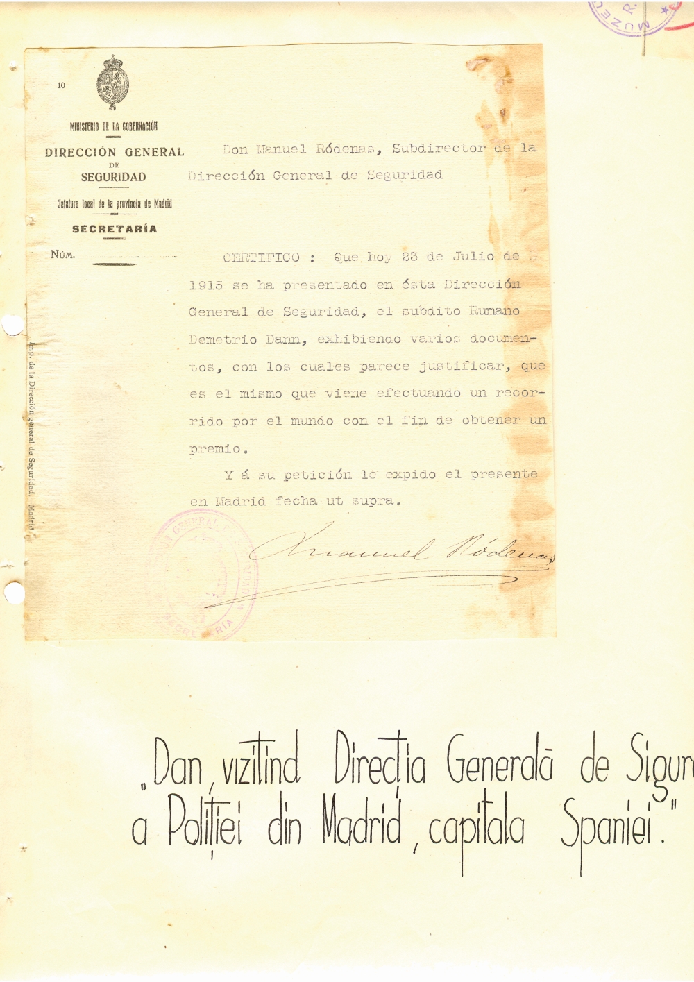 Document prin care se atesta vizita lui Dumitru Dan prin Secretaria, provincial Madrid, Spania. Dimensiuni: 16 x 18 cm. Stare de conservare: hartie ingalbenita, patata, urme de adeziv si mucegai, document lipit pe o coala de hartie. Material/tehnica: hartie, antet tiparit tus negru, dactilografiere, semnatura, stampila.