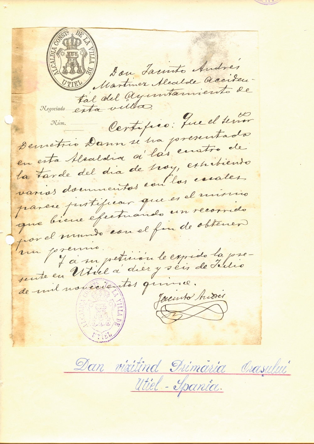Document prin care se atesta vizita lui Dumitru Dan prin Villa de Utiel, Spania. Dimensiuni: 16,5 x 21 cm. Stare de conservare: hartie ingalbenita, patata, urme de adeziv si mucegai, document lipit pe o coala de hartie. Material/tehnica: hartie, mss, tus negru, 2 stampile ovale (tus negru si violet), semnatura.