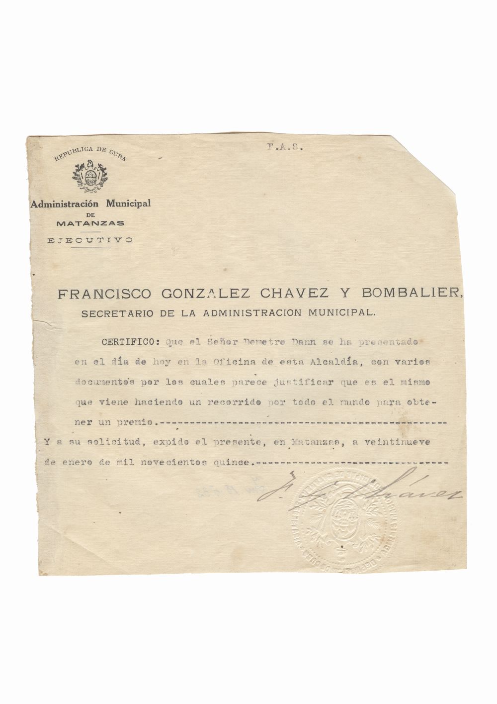Document care certifica vizita lui Dumitru Dan la secretariatul administratiei municipale din orasul Matanzas, Cuba; semneaza secretarul administratiei municipale Francisco Gonzales Chavez y Bombalier. Dimensiuni: 18,1 x 18,1 cm. Stare de conservare: buna, hartie usor ingalbenita, lipsa material, colt dreapta sus. Material/tehnica: hartie filigranata, sigiliu timbrat, antet tiparit - tus negru, dactilografiere, semnatura tus negru.