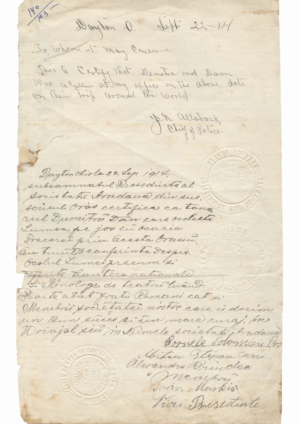 Document care certifica vizita lui Dumitru Dan la Politia Orasului Dayton si la Societatea romana de ajutor Aradeana (fondata la 29.05.1910), Dayton, Ohio, Statele Unite ale Americii. Dimensiuni: 18,5 x 29,7 cm. Stare de conservare: buna, hartie usor ingalbenita si patata, mici rupturi marginale. Material/tehnica: 3 sigilii timbrate, hartie tip dictando, mss, tus negru, 6 semnaturi.