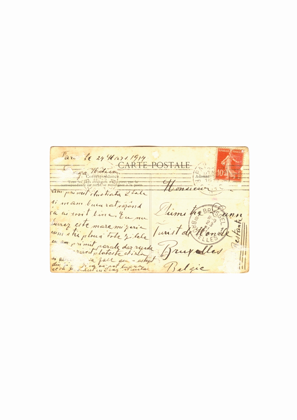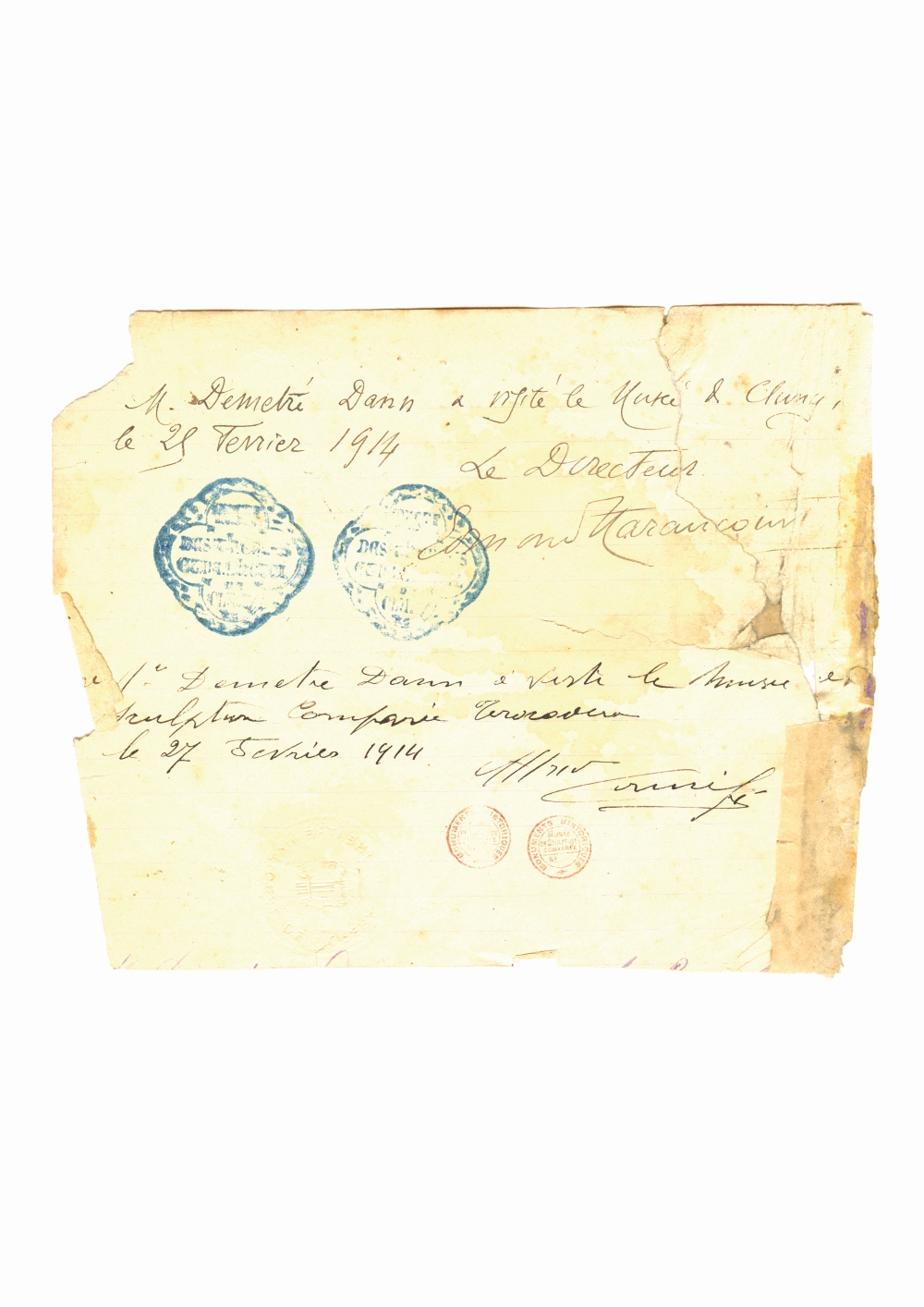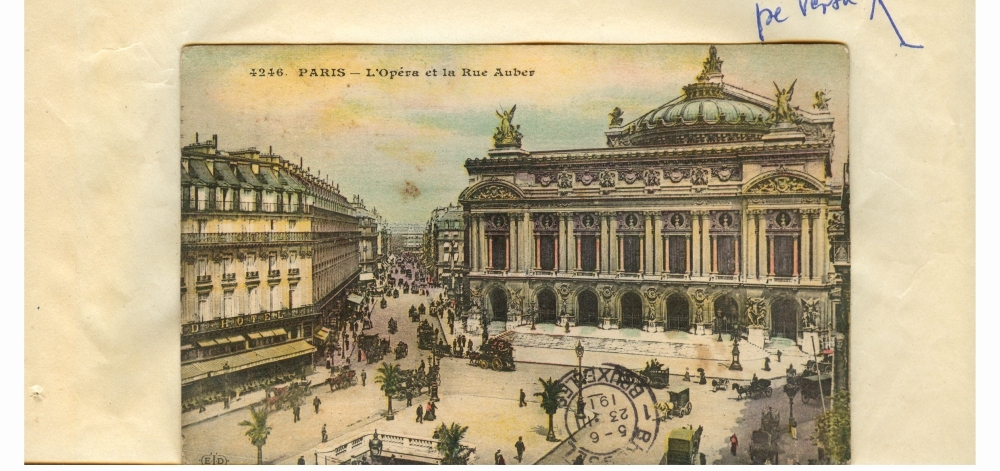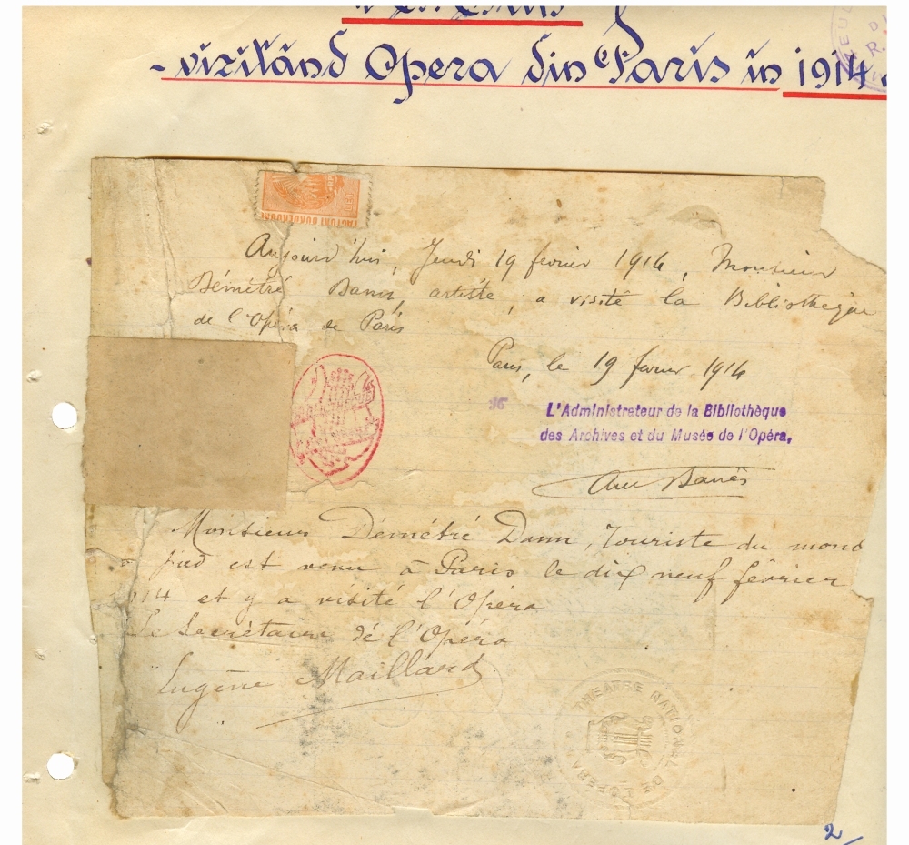 1. Document prin care se atesta vizita lui Dumitru Dan la Teatrul National al Operei din Paris, Franta. Dimensiuni: 21 x 15 cm. Stare de conservare: hartie ingalbenita, patata, urme de adeziv si mucegai, document lipit pe o coala de hartie. Material/tehnica: hartie dictando, mss, tus negru, 2 semnaturi, 2 stampile. 2. Carte postala, color LOpera Paris, Franta. Dimensiuni: 9 x 13 cm. Stare de conservare: buna, uzura functionala, ingalbenire, urme de adeziv. Material/tehnica: hartie cartonata, tiparire, mss, tus negru, timbru postal lipit de 10 centi, 4 stampile rotunde.