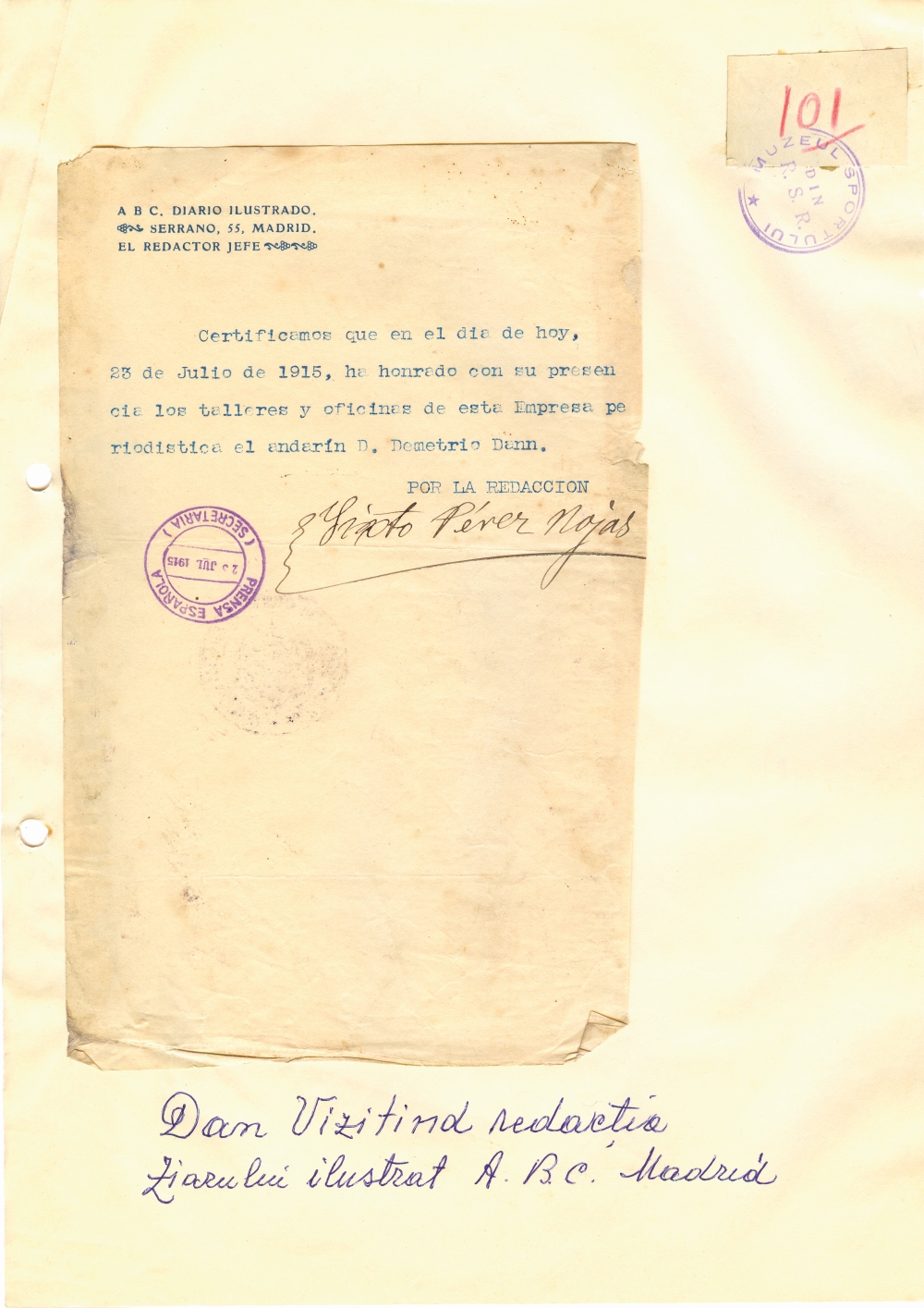 Document prin care se atesta vizita lui Dumitru Dan prin Madrid, la redactia ziarului ABC, Spania. Dimensiuni: 13,2 x 21 cm. Stare de conservare: hartie ingalbenita, patata, urme de adeziv si mucegai, document lipit pe o coala de hartie. Material/tehnica: hartie filigran, antet tiparit, dactilografiere, tus albastru, semnatura si stampila (rotunda, tus violet).
