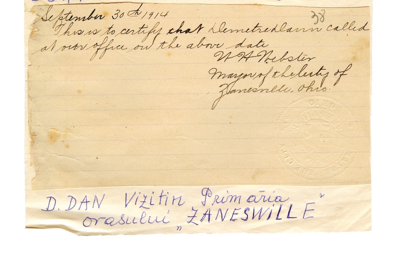 Document care atesta vizita lui Dumitru Dan la Primaria orasului Zanesville, Statele Unite ale Americii. Dimensiuni: 17,8 x 9,3 cm. Stare de conservare: hartie ingalbenita, patata, urme de adeziv si de mucegai, marginea stanga franjurata, document lipit pe o coala de hartie. Material/tehnica: hartie dictando, mss, tus negru, stampila si timbru sec.