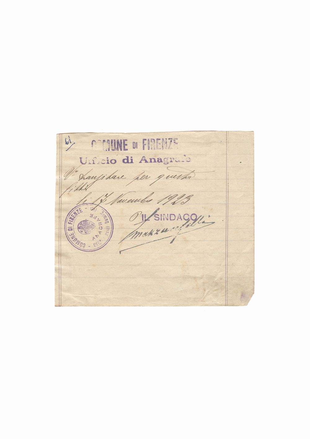 Document care atesta vizita lui Dumitru Dan la primaria municipiului Florenta, Italia. Dimensiuni: 13,4 x 11,8 cm. Stare de conservare: buna, hartie usor ingalbenita si patata. Material/tehnica: hartie, tip dictando, mss, tus negru, semnatura si stampila rotunda, tus violet.