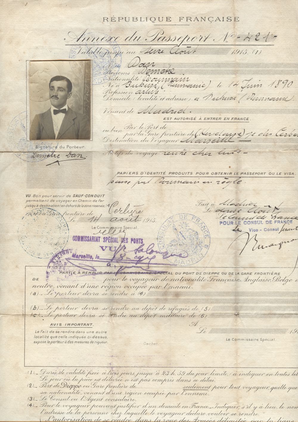 Anexa a pasaportului lui Dumitru Dan eliberata de Consulatul Frantei in Spania, privind acordarea vizei de intrare in Franta prin Cerbere, cu destinatia Marsilia, valabila pentru trei zile. Semneaza indescifrabil viceconsulul Frantei la Madrid. Documentul are fotografia si semnatura lui Dumitru Dan, 5 stampile si alte 3 semnaturi. Dimensiuni: 24,7 x 33,5 cm. Stare de conservare: buna. Material/tehnica: hartie filigranata, tiparire, tus negru, mss, tus negru si violet, 5 stampile rotunde, tus albastru si violet, 4 semnaturi, lipire foto.
