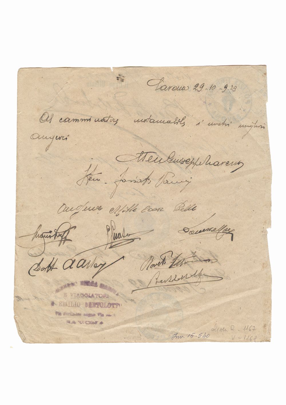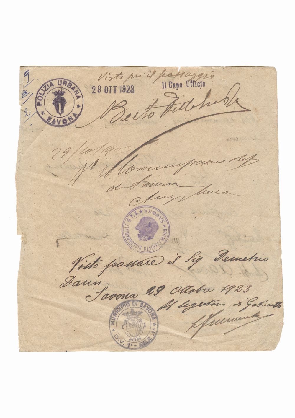 Document care atesta vizita lui Dumitru Dan la politia, comisariatul si primaria municipiului Savona. Pe verso, se atesta vizita la restaurantul (?) Emillio Bartolotta, Savona, Italia. Dimensiuni: 18 x 20,1 cm. Stare de conservare: buna, hartie usor ingalbenita si patata, mici rupturi marginale pe latura stg., necesita restaurare. Material/tehnica: hartie, mss, tus negru, 3 stampile rotunde si una ovala, tus violet, 12 semnaturi.